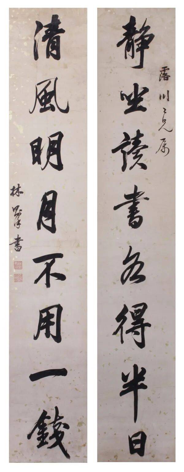 此副行书对联“静坐读书各得半日,清风明月不用一钱”为林则徐纪念馆藏品,冷金粉笺纸质地,横30.1cm,纵173.4cm。