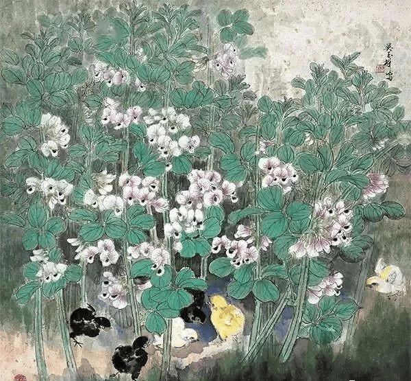 《蚕豆小鸡》兼工带写,盛开的蚕豆丛中,几只小鸡正在嬉戏觅食,画面设色明快巧妙,自然真切,一片生机勃勃的田园景象。