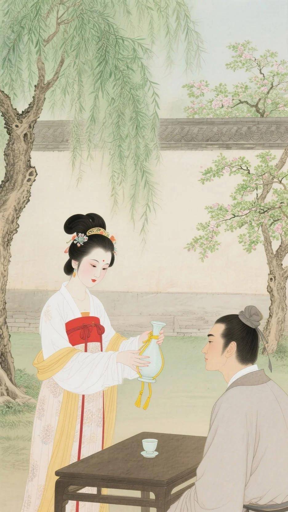 “红酥手,黄縢酒,满城春色宫墙柳。”开篇三个短句,如电影镜头般,迅速勾勒出一幅温馨美好的画面。想象当年,唐婉伸出她那洁白红润的双手,捧着封着黄色丝线的酒壶,为陆游斟酒。他们或许同游沈园,在满城明媚的春光里,在宫墙边婀娜的柳条下,享受着新婚燕尔的甜蜜时光。“红酥手”不仅写出了唐婉手的柔美,更暗示了她整个人的美好贤淑。“黄縢酒”点出了具体的物件,富有生活气息。“宫墙柳”则点明了春日游园的背景,柳色青青,春意盎然,一切都是那么和谐美好。这三句色彩明丽,充满了生活的情趣与夫妻间的柔情蜜意。