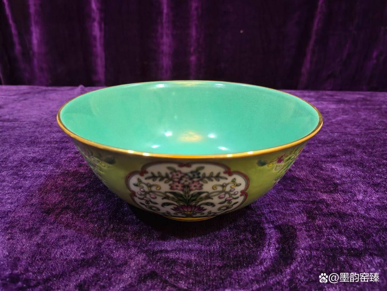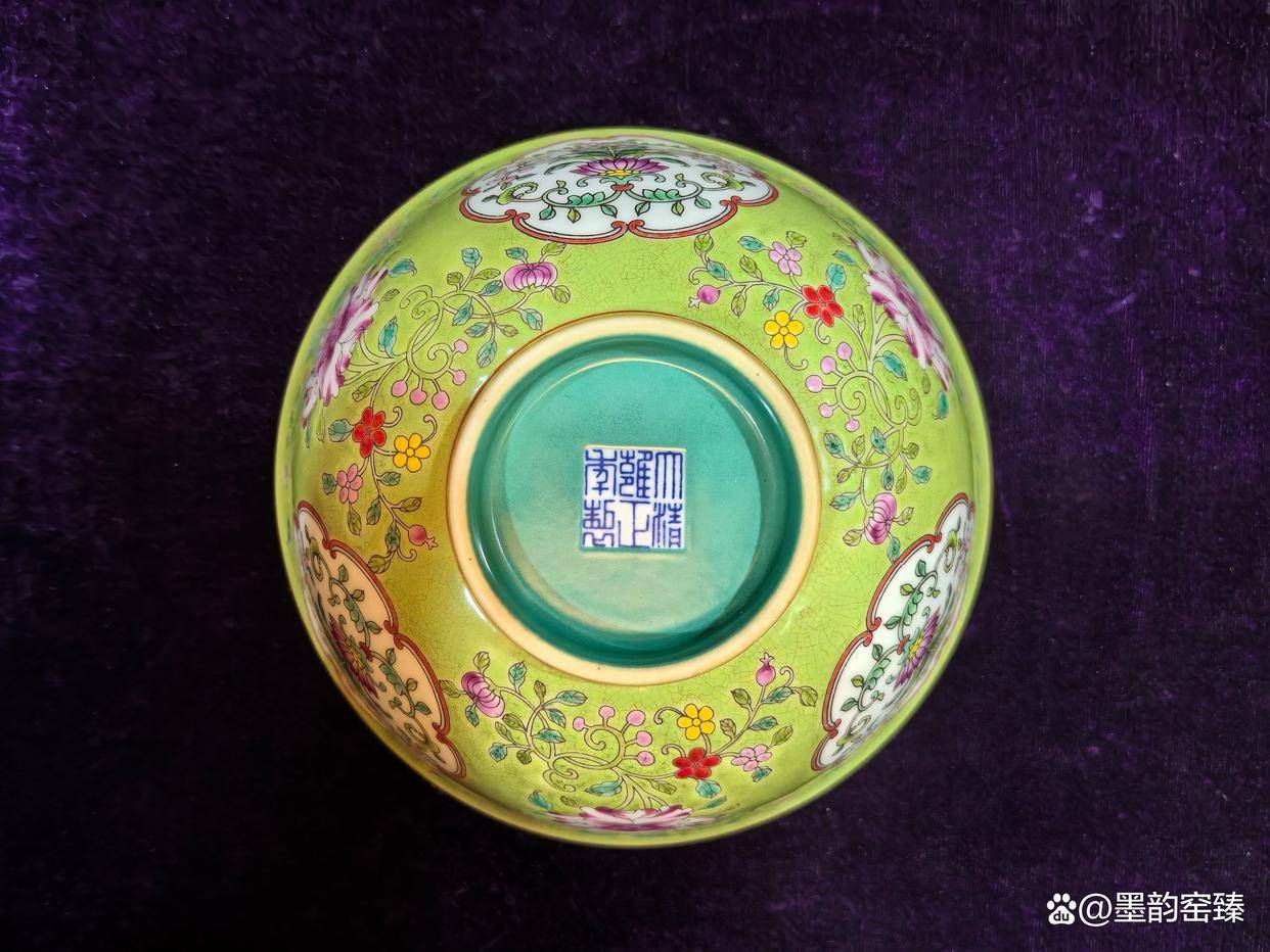 在深紫色天鹅绒的映衬下,它静默如一个沉睡的湖。一道温润、清雅、介于蓝与绿之间的松石绿釉色,包裹着这只碗的周身,仿佛截取了一角雨后初霁的天空,或是从遥远雪山融湖中舀起的一汪碧水。碗壁之上,数朵粉彩牡丹在白色“开窗”内灼灼绽放,枝叶缠绕,金线镶边。当目光移至碗底,那方正的青花篆书“大清雍正年制”六字款识,如同一枚穿越时空的玺印,宣告着它高贵的血统。