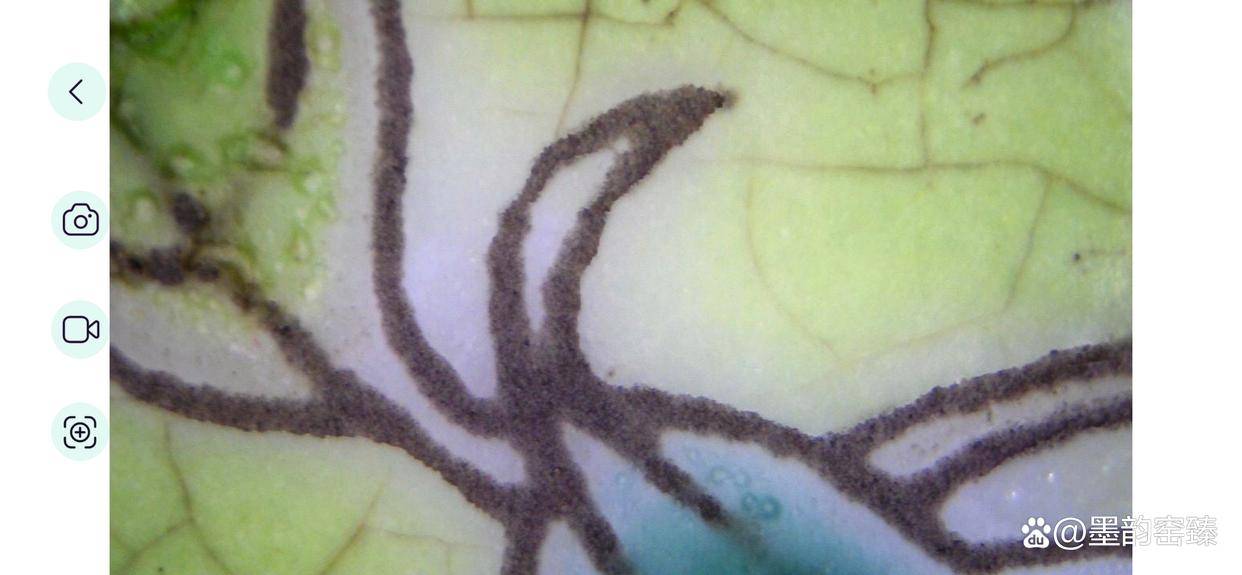 开片,是时光的篆刻。 在高倍放大下,松石绿釉的表面,布满了极其细密、交织如网的自然开片。这些开片并非杂乱无章,其纹路走向自然,深浅不一。更为关键的是,在开片的缝隙中,我们看到了自然的“老化”痕迹:有深沉的氧化铁沁入形成的褐黑色线,有因水汽、尘埃经年累月渗透而成的浅黄色沁染。这种开片网络与色沁的结合,行内称为“网纹”或“百圾碎”,其分布与色泽的过渡极为自然,毫无人为做旧的生硬与呆板。这是釉料在长达近三百年里,因胎釉膨胀系数细微差异,在冷热交替中缓慢形成的“生命的皱纹”,是任何现代速成仿品难以复制的岁月身份证。