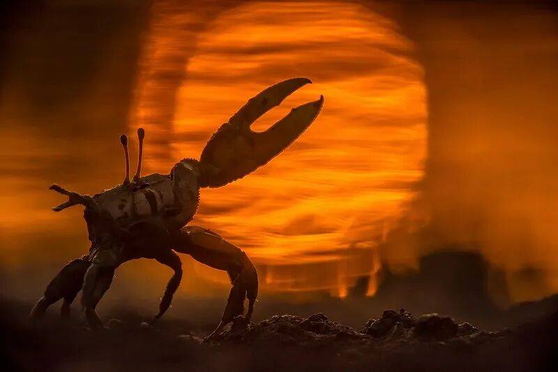 ▲一只螃蟹,在夕阳里举着的钳子。