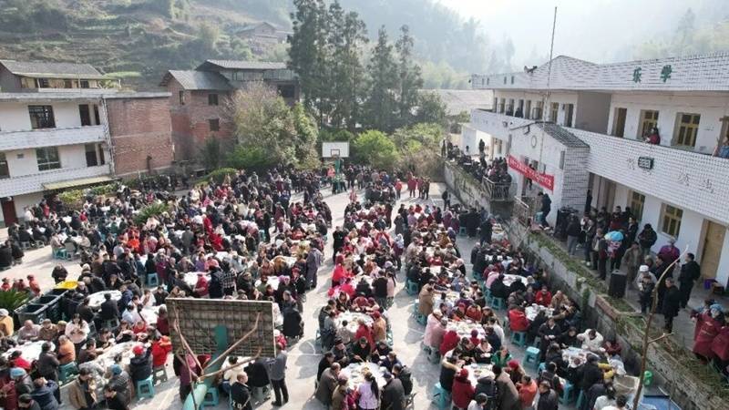 黔北深山杀猪宴开席,村民网友齐聚村校广场热闹赴宴。