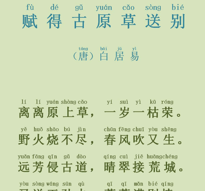 最终,《赋得古原草送别》这首诗歌成为了编选的目标。这首诗意境深远、简洁易懂,因此适合小学生阅读。但有些人提出异议,认为这首诗后半部分有些过于凄凉,孩子们未必能够理解其中的深层含义。于是,在课本中,最终只保留了诗歌的前半部分:离离原上草,一岁一枯荣,野火烧不尽,春风吹又生。这段文字表达的是生命的顽强和希望,让人感受到一种鼓励与坚持的力量。对于处在人生初期、充满梦想与期待的孩子们来说,这首诗正是最好的精神食粮。