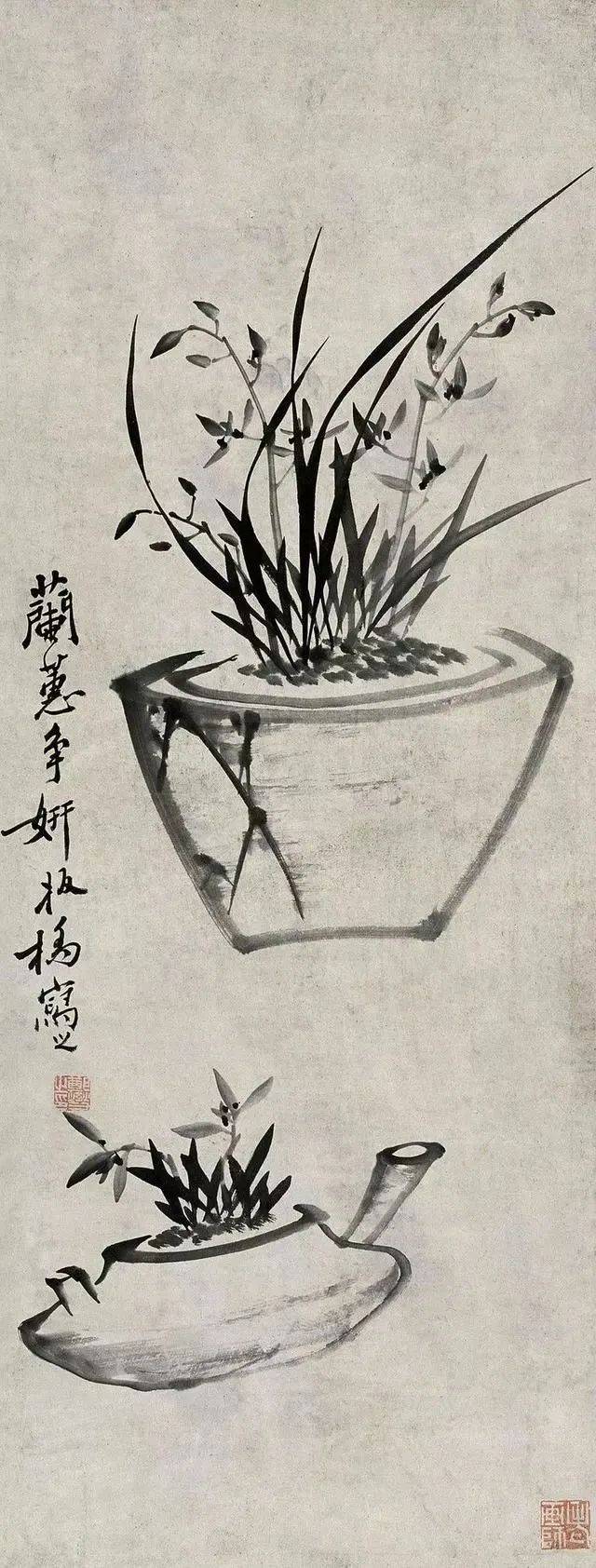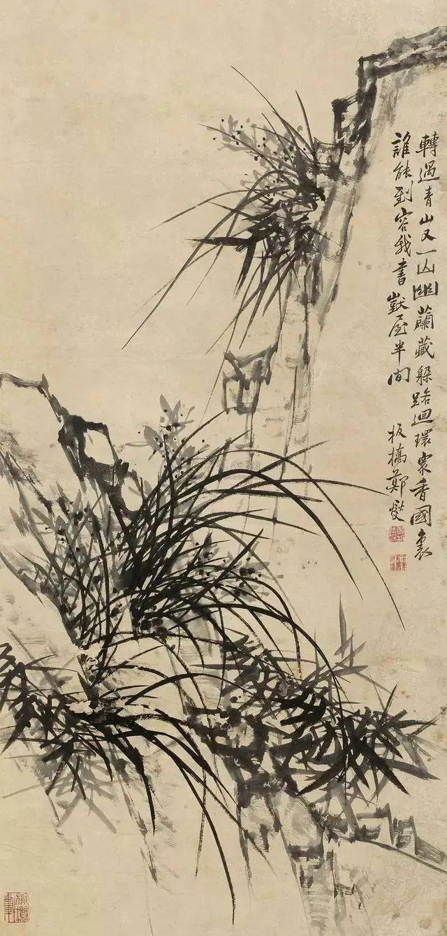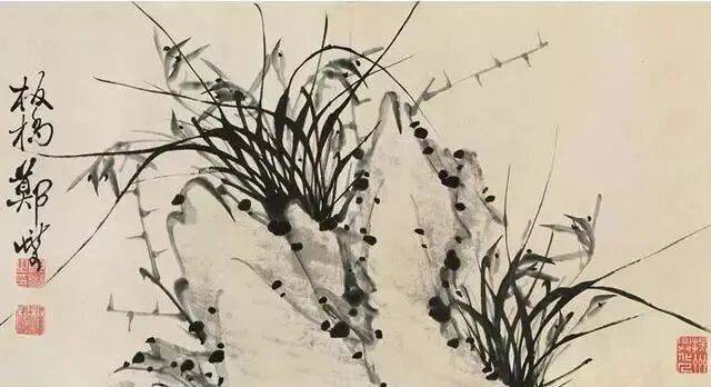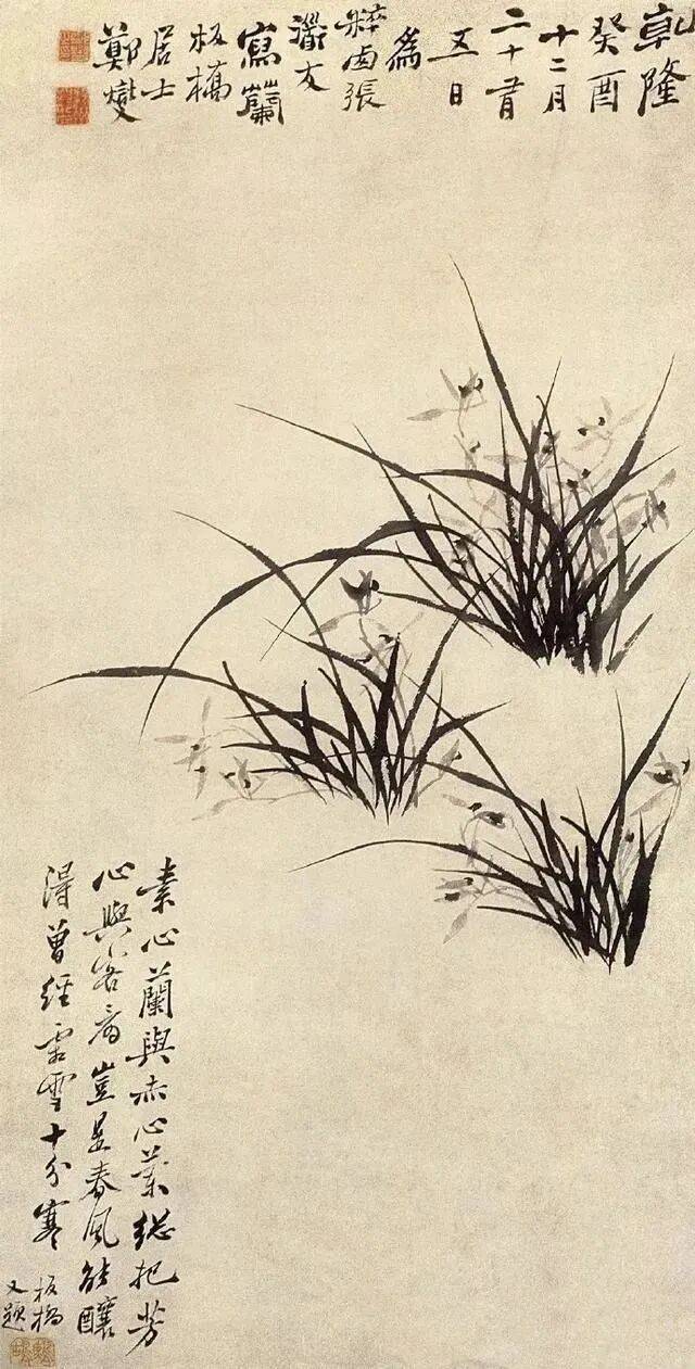 上面这幅作品画有三丛兰花,浓墨写就兰叶,俊逸多姿;淡墨勾出兰花,清雅可人,花心用浓墨点出,般配着左下角的题诗:素心兰与赤心兰,总把芳心与客看。岂是春风能酿得,曾经霜雪十分寒。兰花的芳心,就在这一刻散发出幽香。