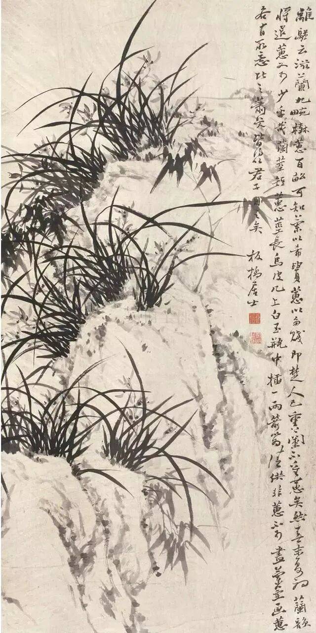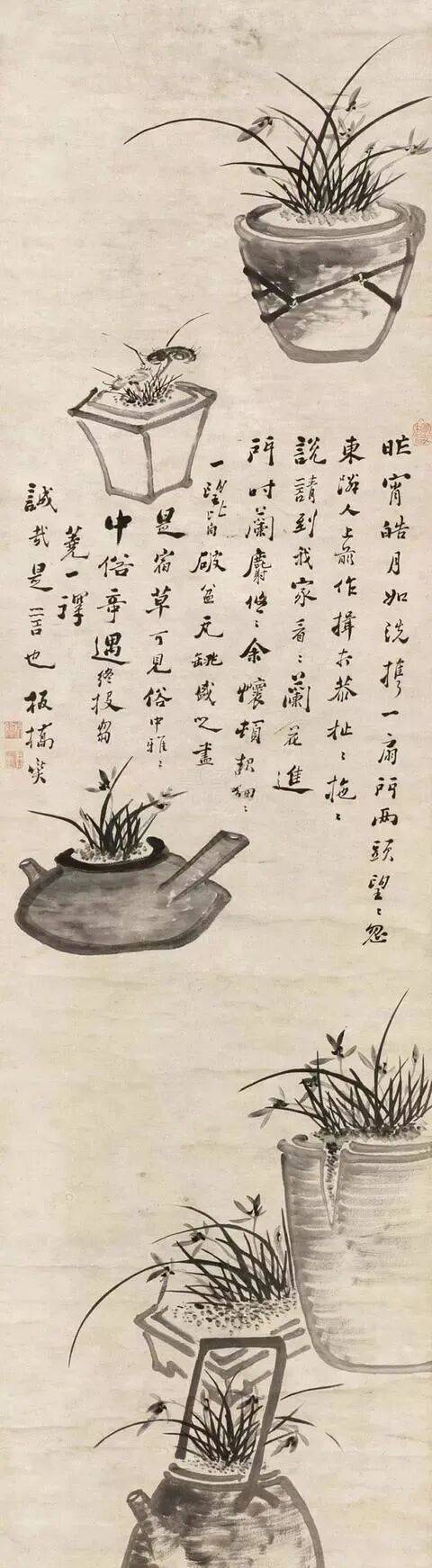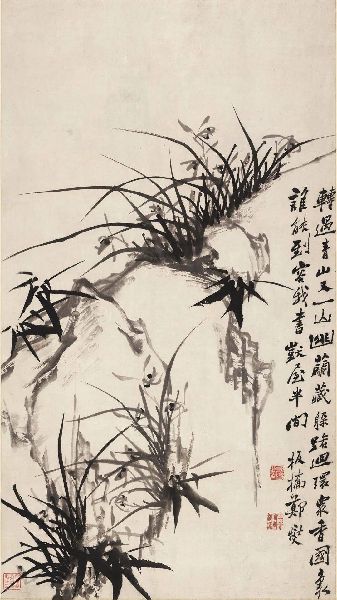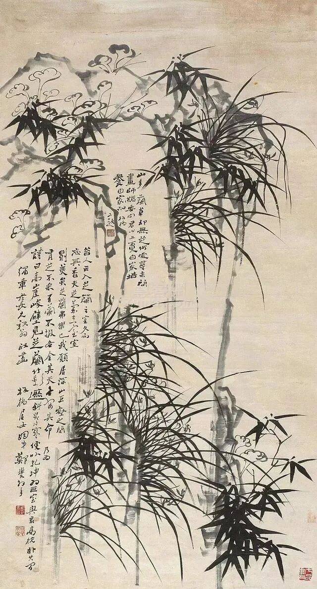 上面这幅作品画有三丛兰花,浓墨写就兰叶,俊逸多姿;淡墨勾出兰花,清雅可人,花心用浓墨点出,般配着左下角的题诗:素心兰与赤心兰,总把芳心与客看。岂是春风能酿得,曾经霜雪十分寒。兰花的芳心,就在这一刻散发出幽香。