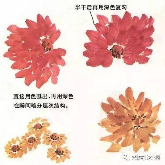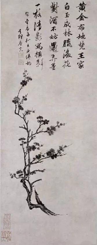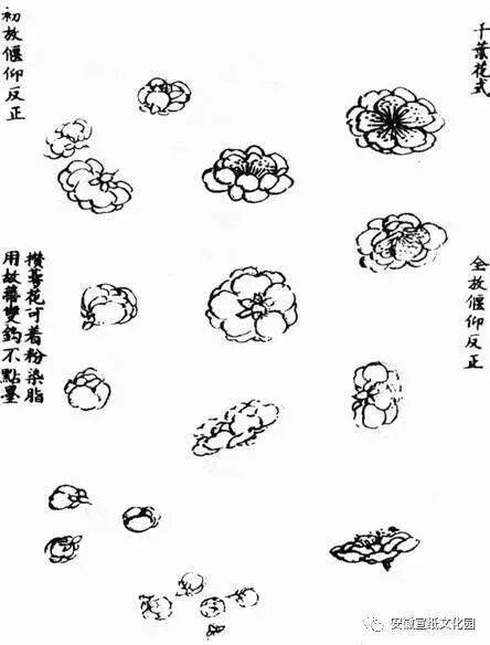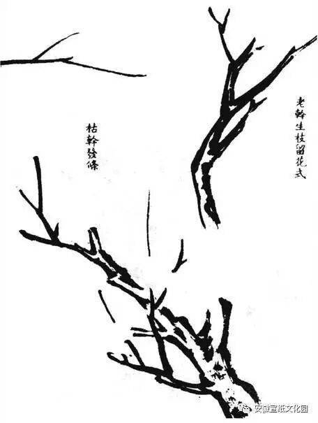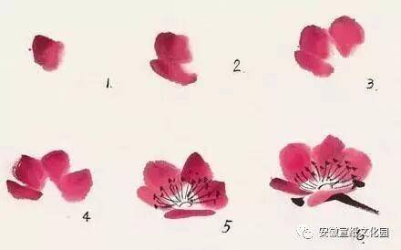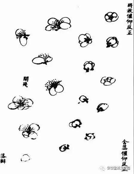 梅的种类很多,江南多红梅,北方无红梅,仅见黄梅和蜡梅。画梅的表现方法也不同,有圈梅、墨梅、红梅、粉梅、白梅、赭梅、黄梅、绿梅之分。画梅以圈花最难,论者以为数十年尚未能入格。圈花用笔要似圆非圆,似方非方,大小相衬,前后左右攒聚。圈瓣之外,又须研究破蕊法。画梅要注意蕊、萼、须、英。画时用渴笔圈瓣,以淡墨画须,以深墨点英。画蕊时须视花之反正欹仰来斟酌点蕊方向。花须不宜太多,五七笔就行,点英可超出五七点,但不能太多,太多则乱。一般画“野梅”,只画花须,不点英。墨梅亦可纯用深墨画蕊萼,亦可用渴笔点椒。