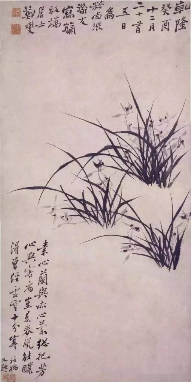 撇长叶、折叶难度更大些,主要在于要掌握好行笔的提按与腕力的灵活,要站着画,以腕运指,力来自臂、肘、腕然后到指,充分运用好腕力,行笔才能灵活。每一叶片无论长短都要送出而不能甩出。笔断意连这在撇长叶中是经常遇到的,折笔既要体现兰叶的轻柔,又要折得有力度,要柔中有刚。在叶的组合上,长短、粗细与疏密要有变化,穿插交错有致。对画一丛兰叶或分布在画面上下的多株兰叶,在墨色上要有浓淡层次变化,不可不分远近地一律黑色。在叶子的分布上切忌杂乱无章,漫无秩序,要宁少勿多。
