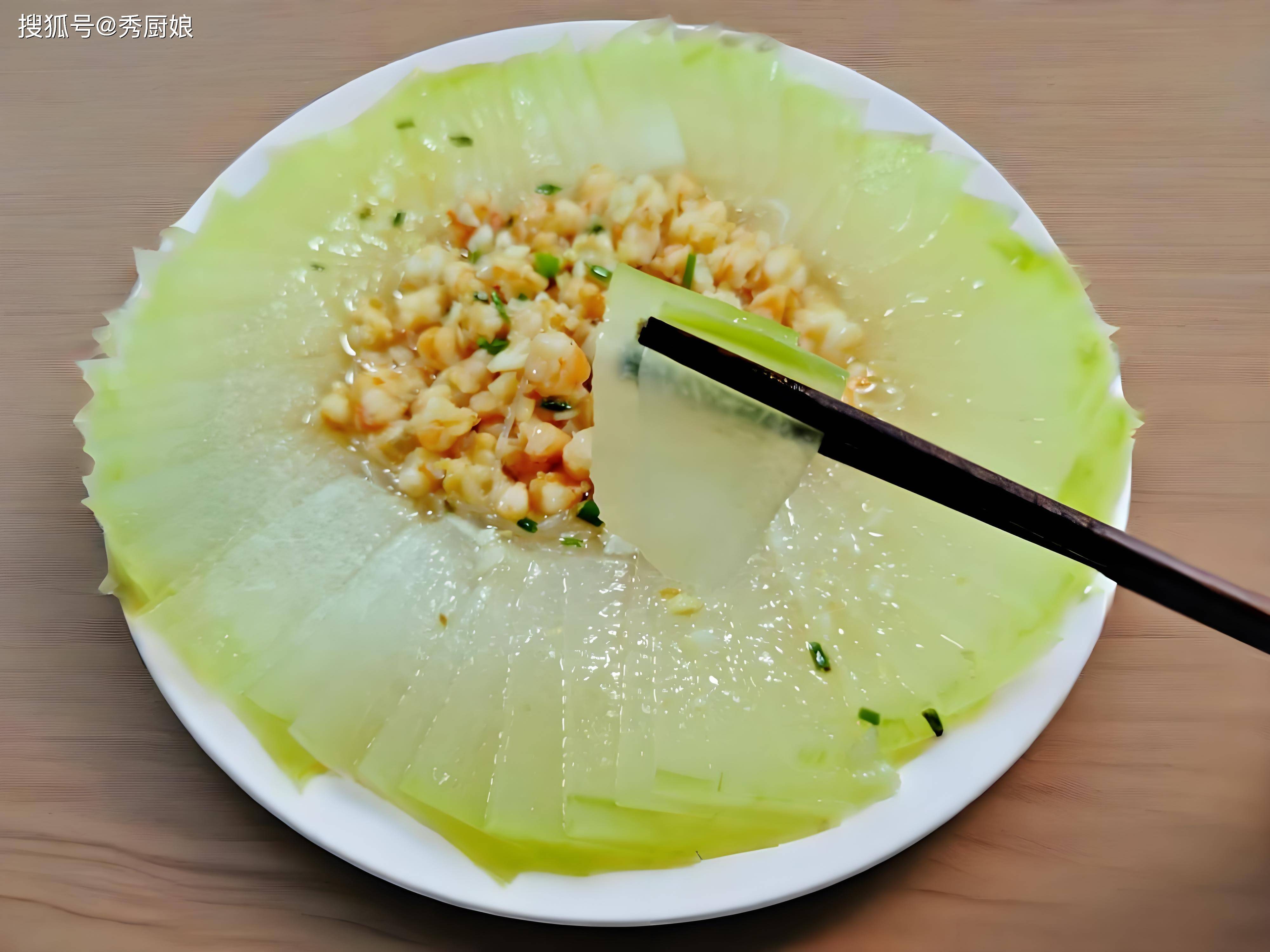 1. 冬瓜去皮去瓤,切成稍厚的片,铺在深盘子里。干龙口粉丝一小把,用温水泡软,剪短后铺在冬瓜上。