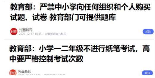 12月16日,教育部扔下重磅炸弹:2026年开始,全国中小学一律不准再买校外商业试卷,各种“周周测”“月月练”直接消失,小学一、二年级连纸笔考试都不用!