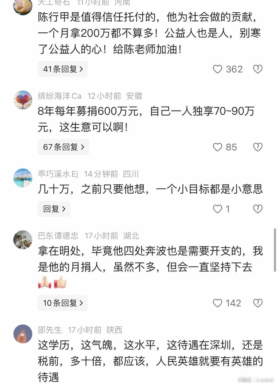 有人支持陈行甲,说他是名人,做的事情大家认可,生活成本高,拿高薪没问题,还有月捐人表示,我就是冲着他去的,钱花得明白,我乐意,但也有人觉得不对劲,公益不是公司,不该按市场价发工资,你靠几个明星拉捐款,结果大头都给了自己人,那公众的信任慢慢就被磨掉了,制度上没错,可实际效果让人心凉。