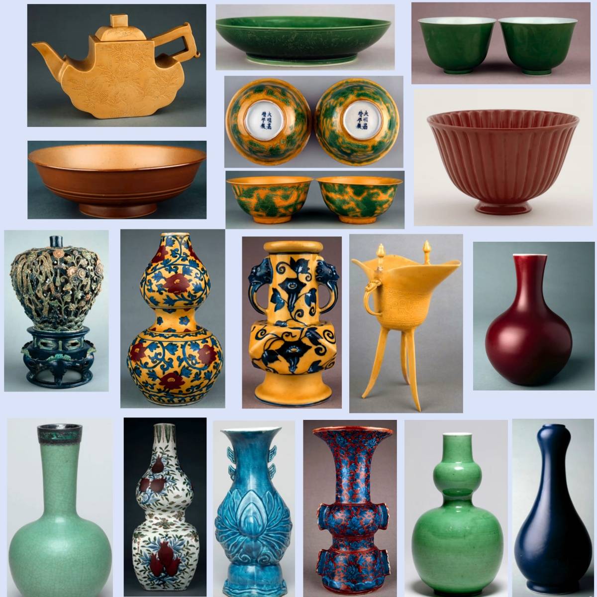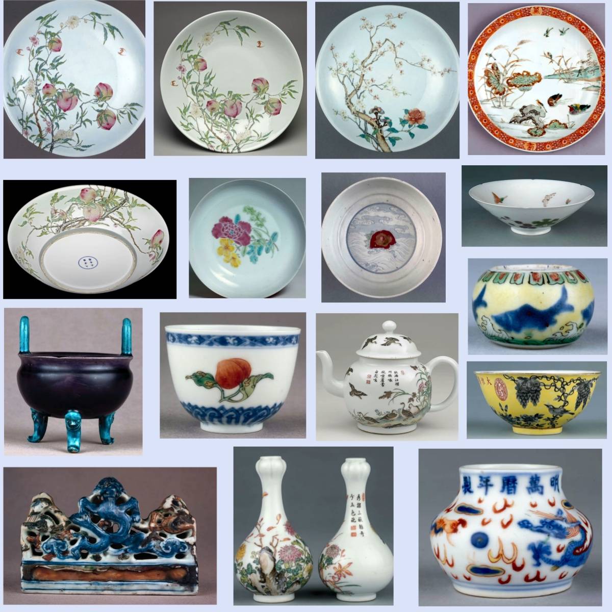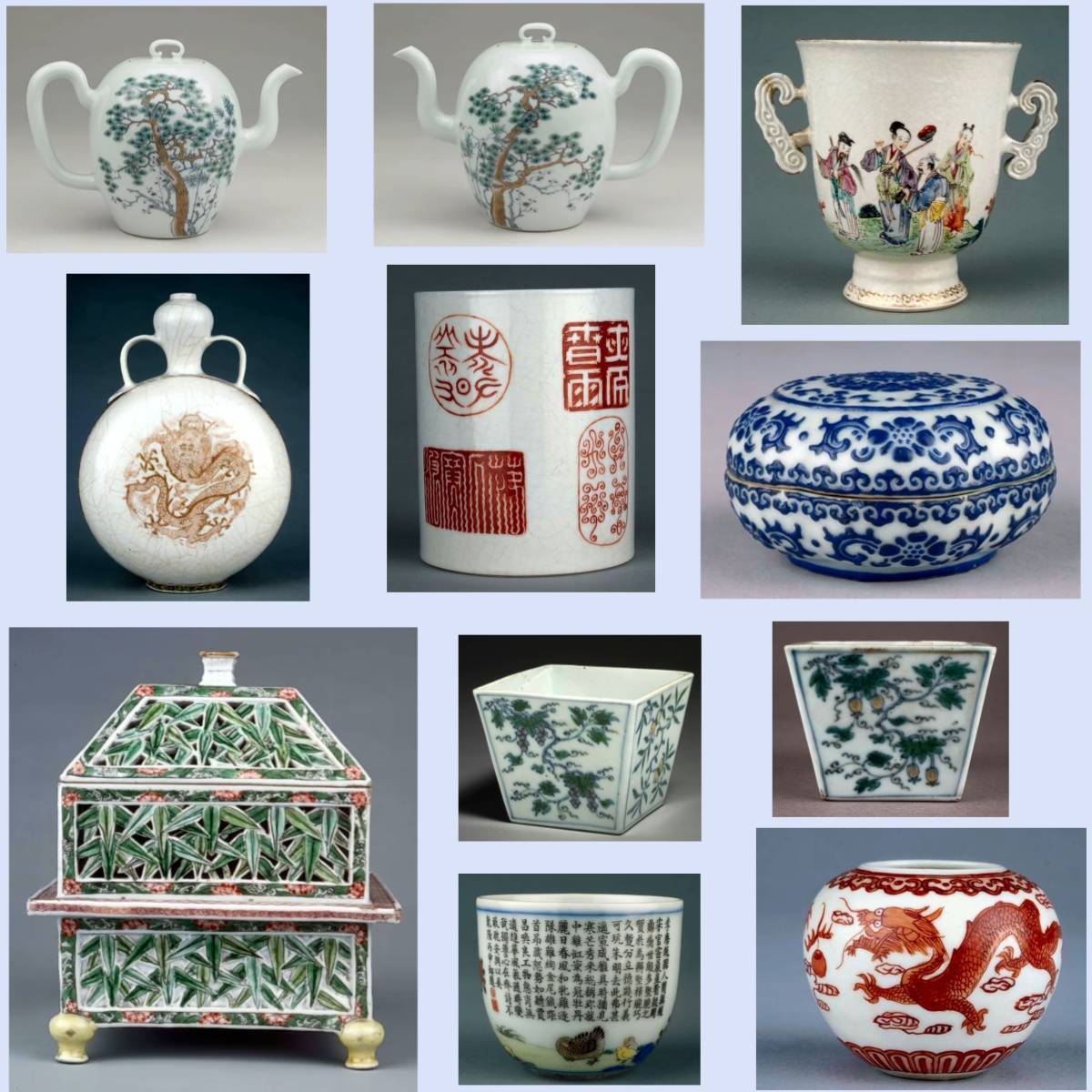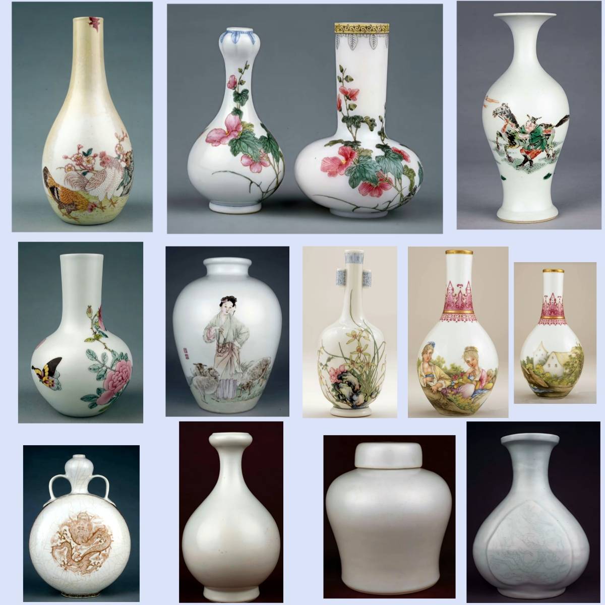 代表:康熙、雍正、乾隆三朝,青花、五彩、粉彩、珐琅彩瓷器,造型多样,装饰繁复精美。