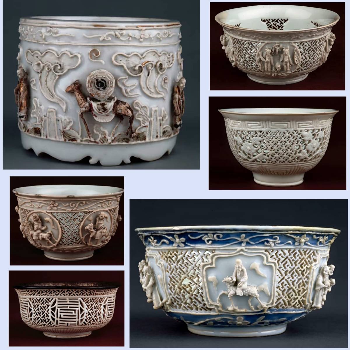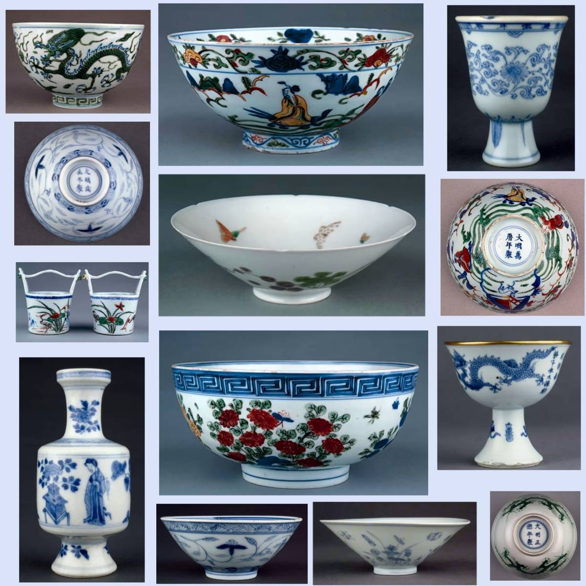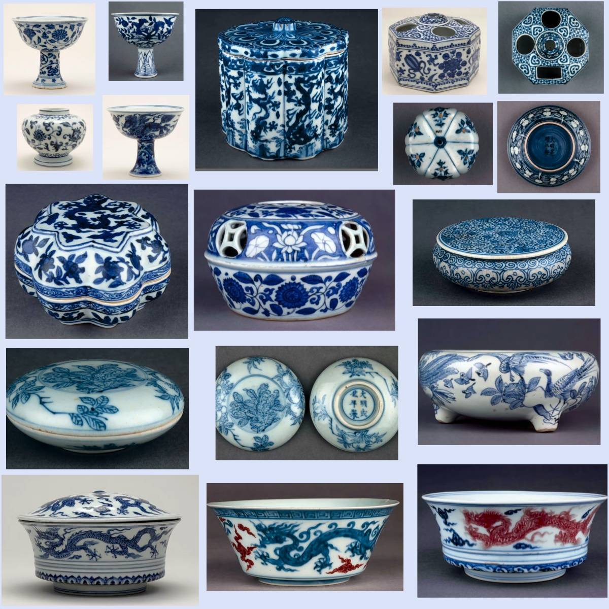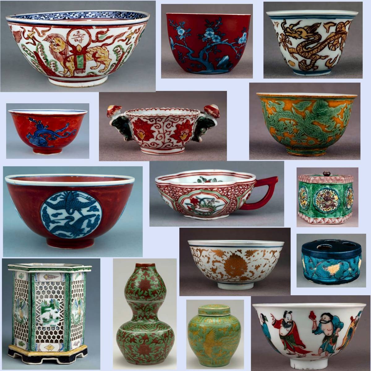 代表:康熙、雍正、乾隆三朝,青花、五彩、粉彩、珐琅彩瓷器,造型多样,装饰繁复精美。