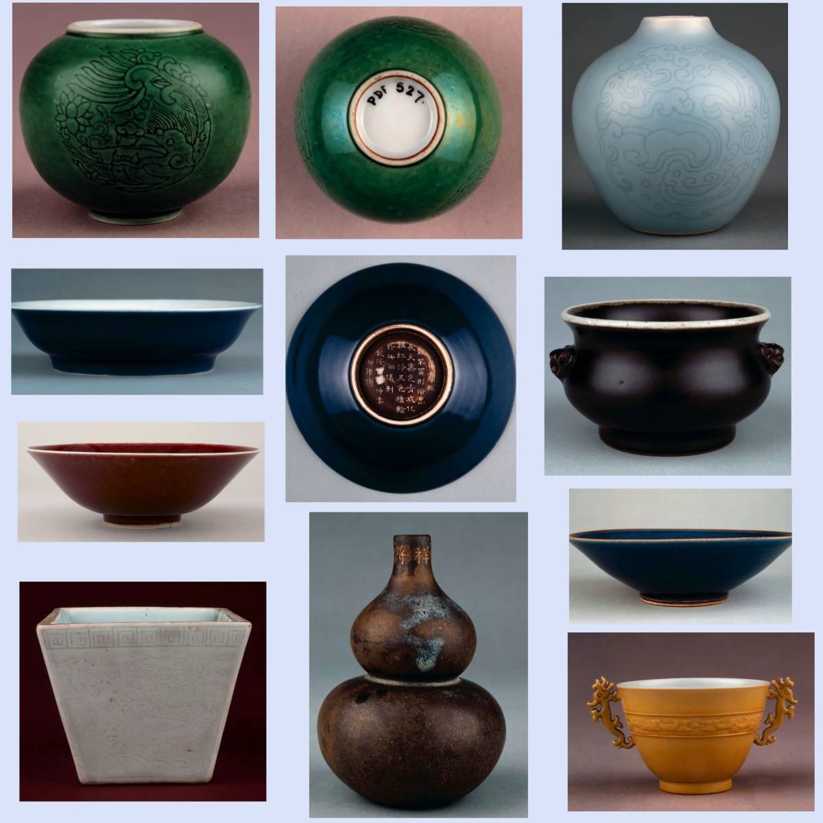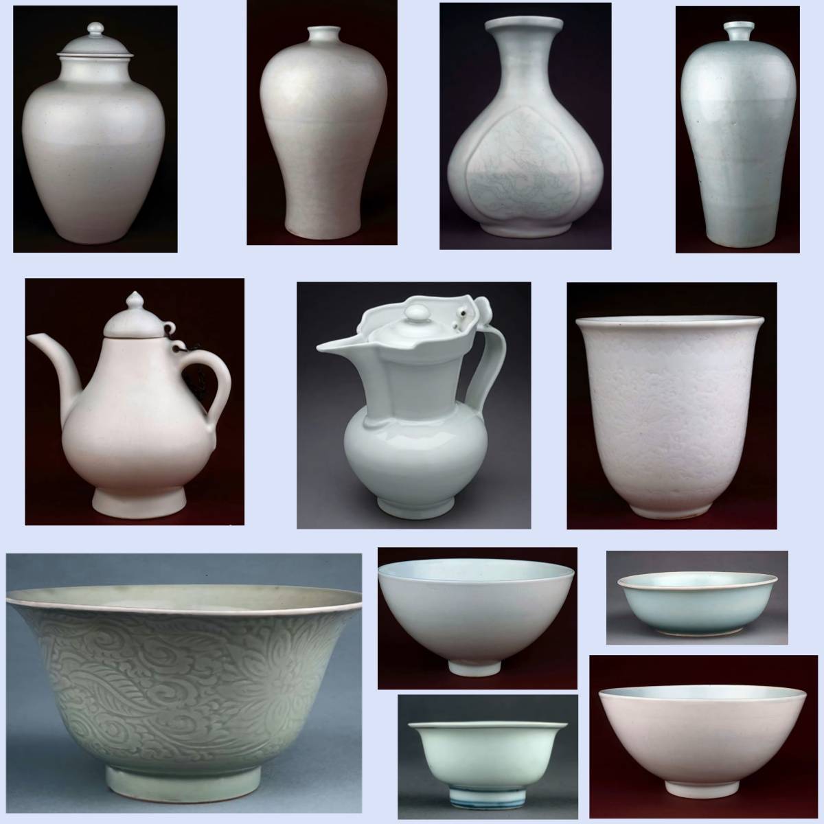 代表:汝窑的雨过天青、官窑的开片、定窑的白瓷、龙泉窑的青瓷等,风格各异但都极致精美。