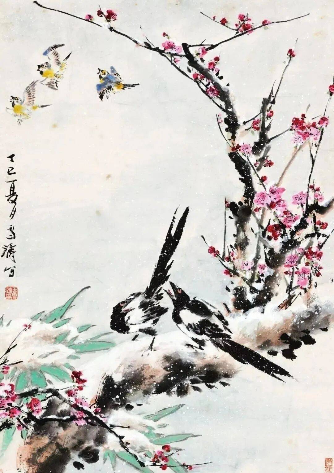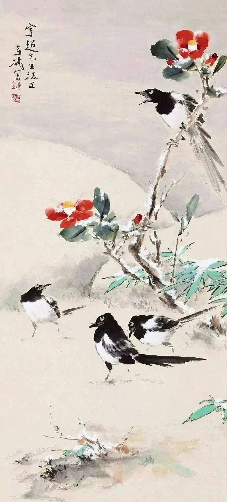 在雪涛先生笔下,雪常与花鸟搭配。与花鸟搭配,如雪中梅、竹,山茶,喜鹊等,展现生机与活力。