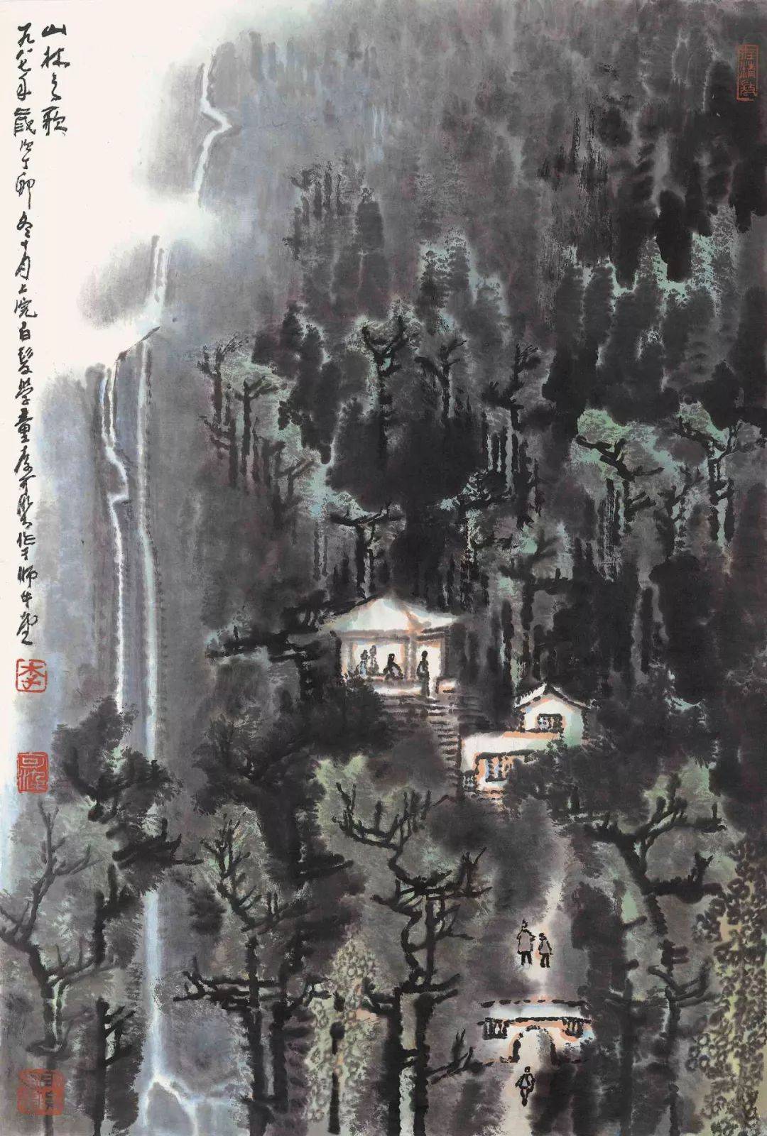 山势迎面而来,屋舍隐于山间,瀑布浓缩为几条白色的裂隙,把光引入画面,通过探索“光”与墨的变幻,表现山林晨夕间的逆光效果,整个画面像蒙上了一层淡淡的薄雾,朦胧迷茫、流光徘徊,给人以独特的艺术感受。