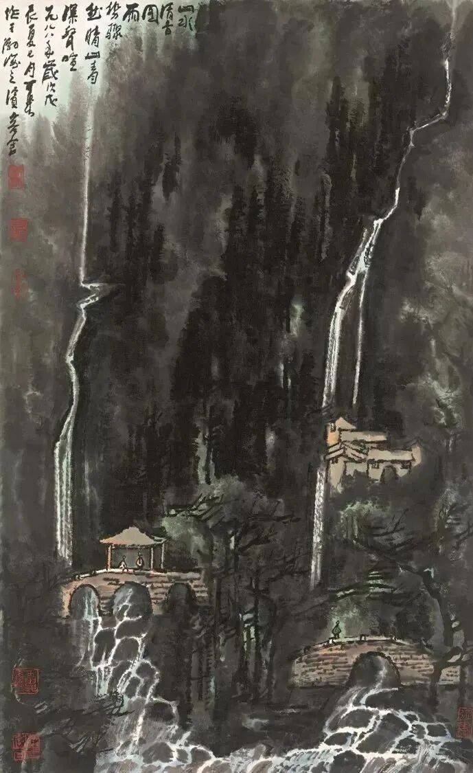 李可染《山村飞瀑人家》
