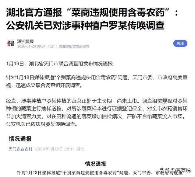 信息来源:湖北官方通报“菜商违规使用含毒农药”:公安机关已对涉事种植户罗某传唤调查