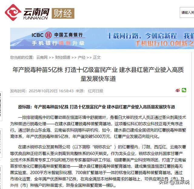 信息来源:年产脱毒种苗5亿株 打造十亿级富民产业 建水县红薯产业驶入高质量发展快车道