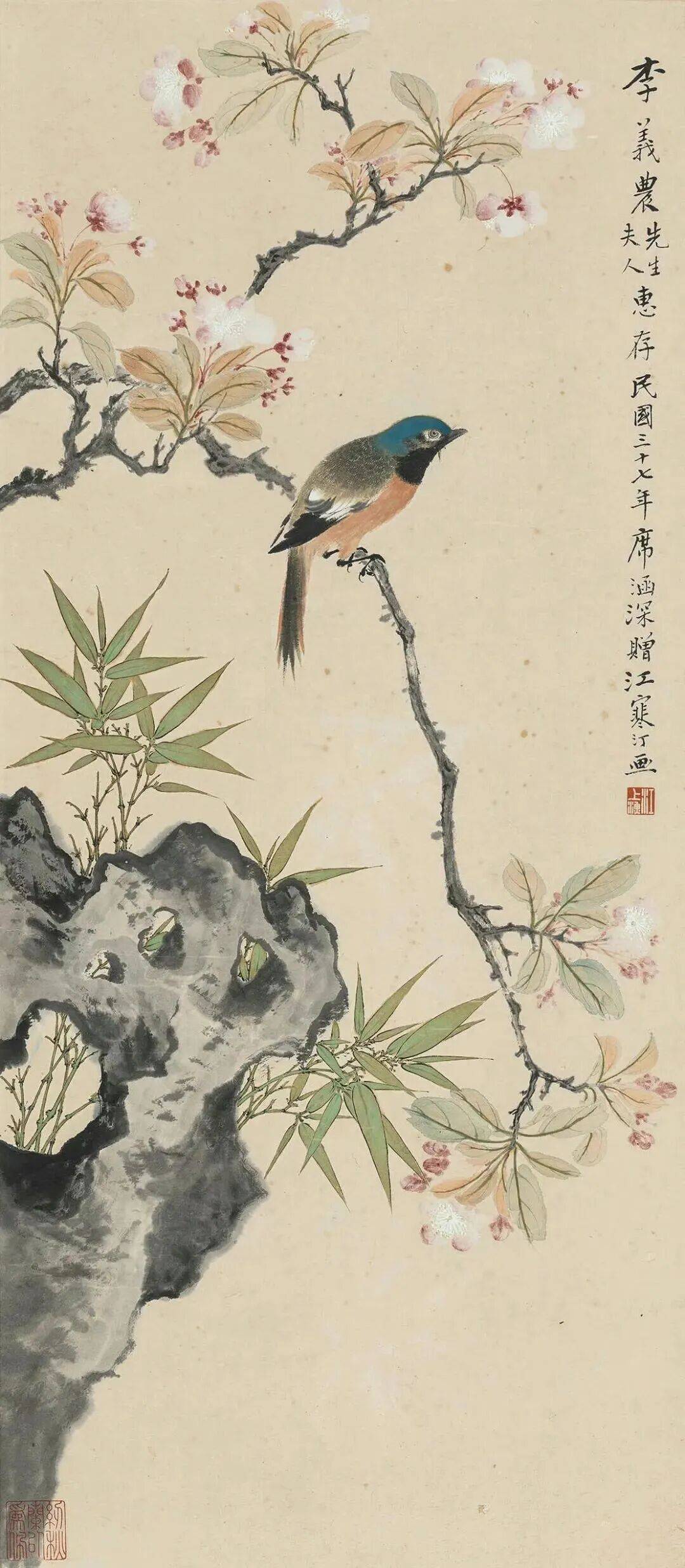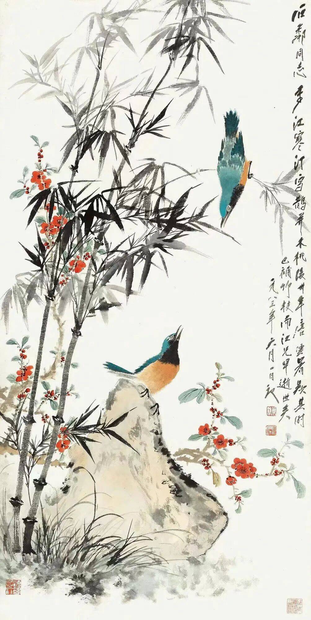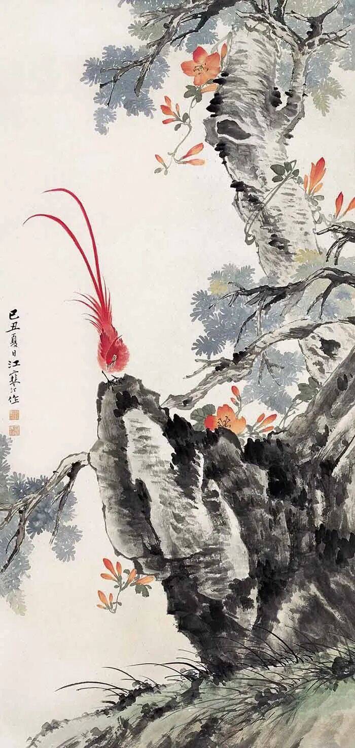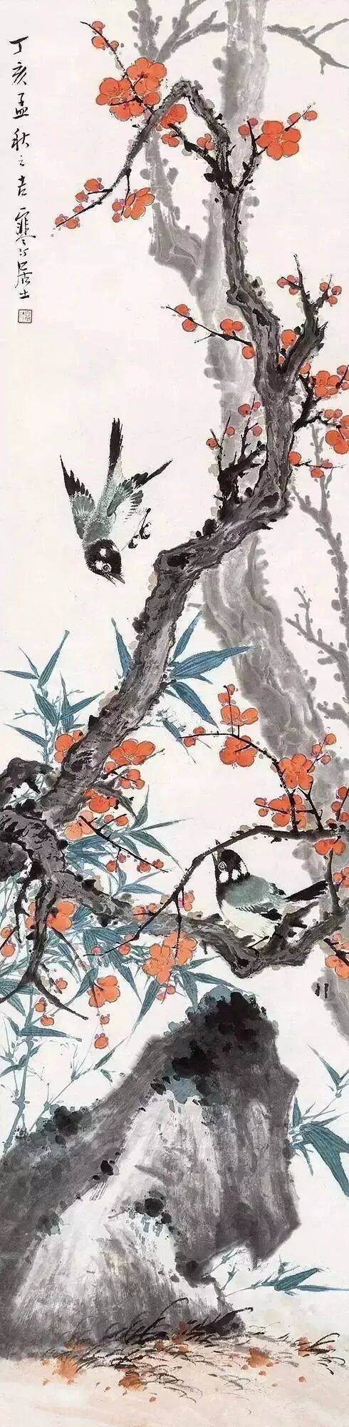 禽鸟的背景,常用山石、流水、坡岸、花草作为点缀。画石一般先勾外轮廓,再分石纹,然后皴染。也可不勾轮廓,直接用墨或颜色点染,即没骨法,但用墨用色宜浓淡适当,忌平板、模糊一片。变化有致的背景点缀,有益于衬托画面禽鸟的生动神态。