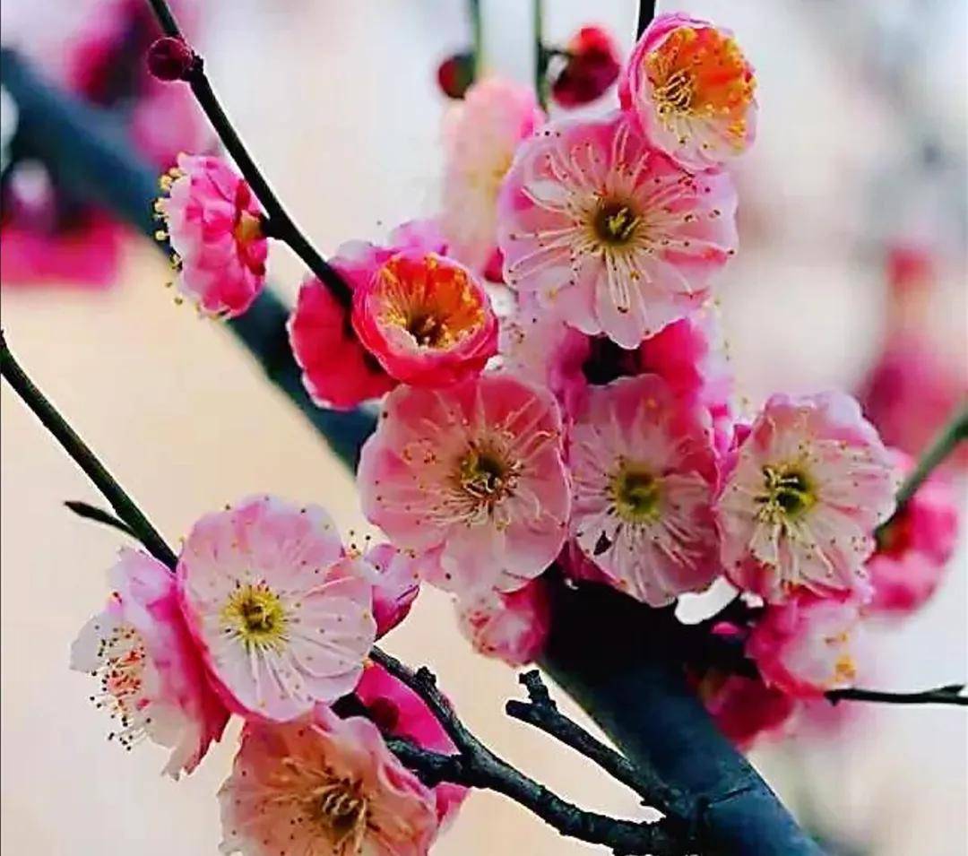 在梅花分类体系中,真梅系是最纯正的梅花种群,直枝梅类则以枝条挺拔为显著特征,宫粉型梅花多以花色艳丽、花型饱满见长,而别角晚水梅更是将宫粉型的优势与独特性状完美融合,成为梅花品种中的佼佼者。