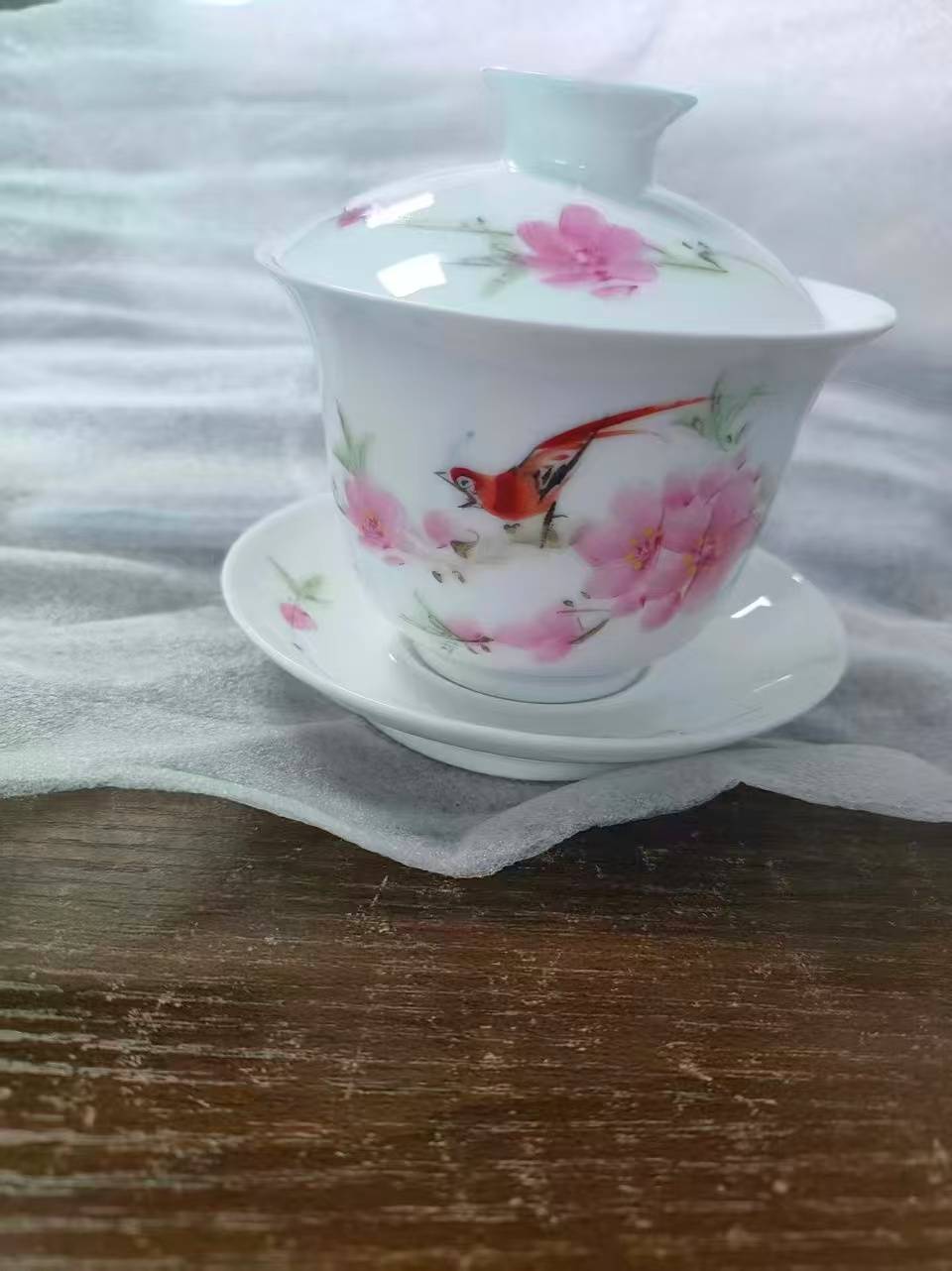 若要深究其魅力之源,必先从它繁复精绝的制作工艺谈起。粉彩瓷的诞生,是陶瓷装饰史上的一场革命性突破。其制作工序极为繁复,堪称“过手七十二,方克成器”。首先需选用上等瓷土,经拉坯、利坯、晾干、素烧成洁白的瓷胎,谓之“白胎”。然后在白胎上以墨线起稿,勾勒出花鸟纹样的轮廓。接下来便是核心工序——填色。粉彩之所以得名,关键在于其使用了玻璃白(一种含砷的乳白色玻璃质颜料)打底。工匠在需要渲染的部位,如花瓣、鸟羽处,先施一层玻璃白,再于其上敷染各种彩料。玻璃白具有不透明性,能使覆盖其上的彩料产生粉润柔和、深浅不一的过渡效果,一改五彩(古彩)的生硬单调,获得了如同纸上工笔没骨画般的细腻层次与立体质感。彩料种类繁多,仅红色便有胭脂红、矾红、洋红之别,绿色有松绿、水绿之殊,再经低温二次烧成(约700-800摄氏度),彩料与釉面完美熔融,最终呈现出色泽粉嫩、晶莹剔透、触感温润的艺术效果。盖碗上的花鸟纹饰,往往构图疏密有致,笔法工细入微,鸟的羽毛丝丝分明,花的瓣蕊翻转生动,其绘制难度与艺术性,丝毫不逊于绢纸之上的工笔重彩。