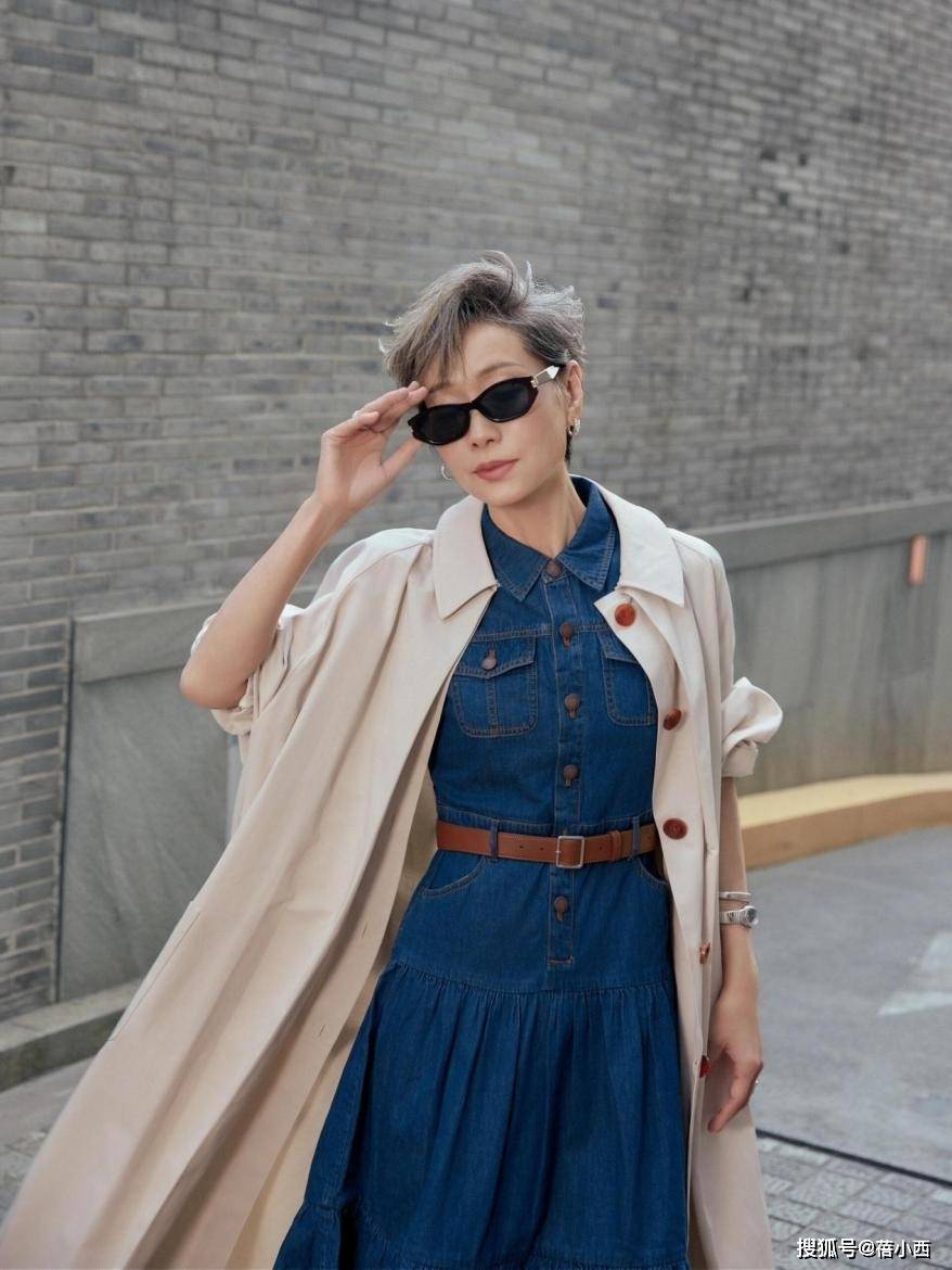 米白色中长款风衣不管在哪种场合,都是亮点般存在。宽松版型在视觉上会给人留下随性、遮肉的印象。袖口可随意挽起,这样的话,让穿着者多了几分洒脱。深蓝色牛仔裙融入了翻领设计,其极具利落感。腰间有一条棕色皮带,起到勾勒腰线的作用,它可避免宽松版型显臃肿的问题。再戴上一副墨镜,让你拥有两米八的气场。
