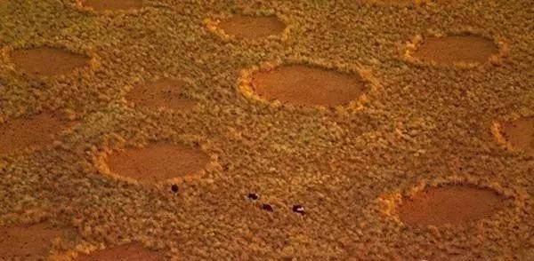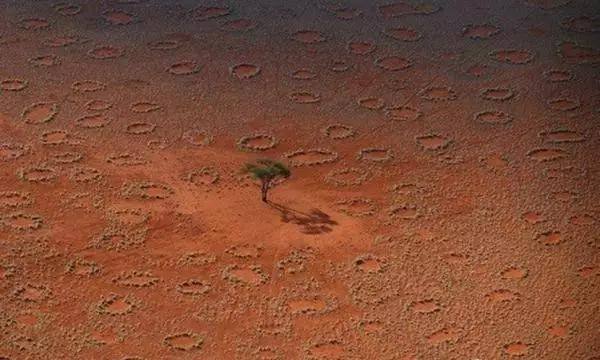 仙女环,纳米比亚。这些神秘的环形图案其实是非洲草原上不生寸草的土地。大的有30英尺宽。科学家认为,这是地底的白蚁吃掉了环里的植被而造成的。