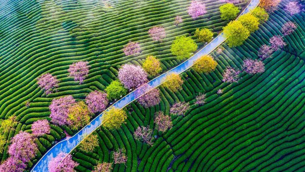 茶田夹杂樱花、相互映衬,格外有情调
