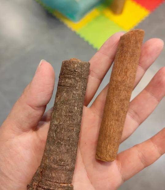 买桂皮很有讲究,要选“肉桂”,不要选那种薄得像纸一样的烟桂。好的桂皮卷曲度好,皮厚实,表面呈灰褐色,里面的红棕色油纹明显。把它掰断闻一下,应该有浓郁的甜味和辛味,而不是刺鼻的味道。