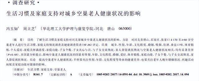 [1]冯玉如,周立芝.生活习惯及家庭支持对城乡空巢老人健康状况的影响[J].中国老年学杂志,2017,