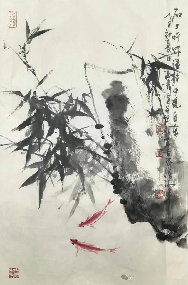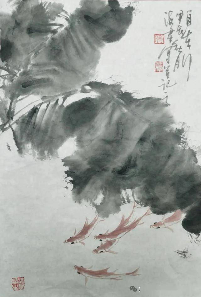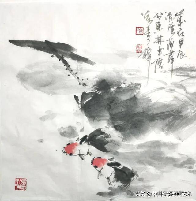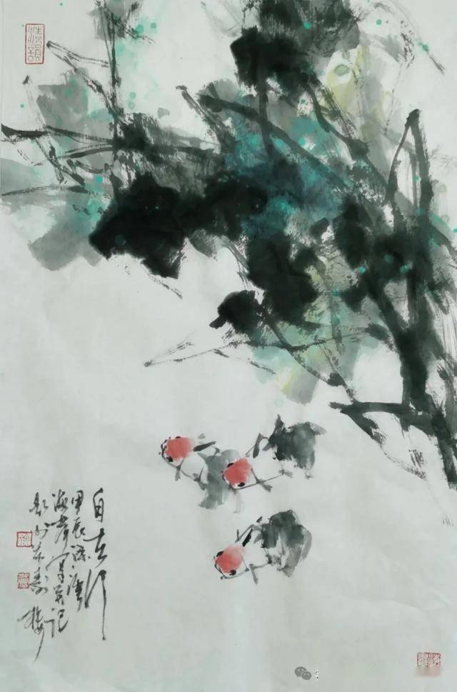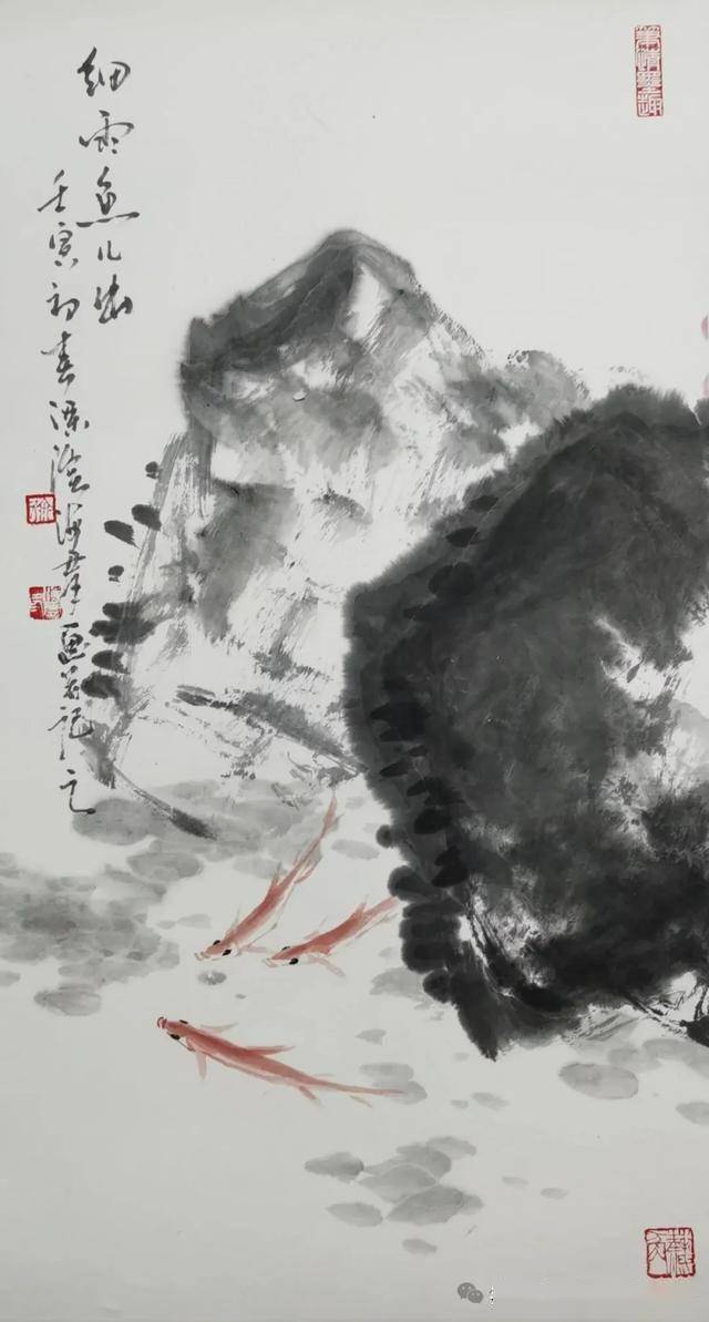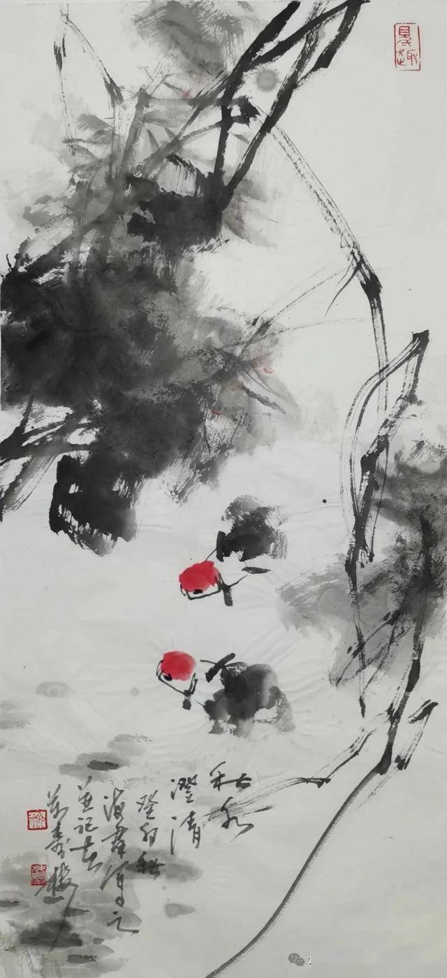 这幅无锡画家徐海群的写意花鸟《细雨鱼儿出》作品,延续了他一贯的“以墨写意、以色点睛”的创作风格。