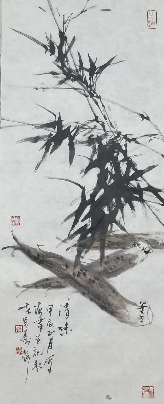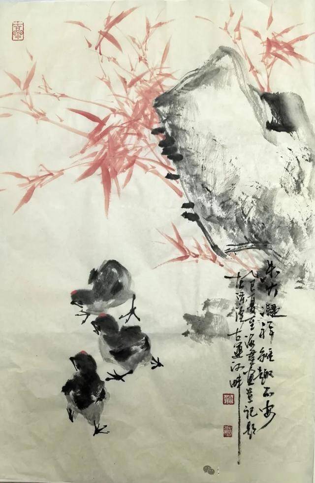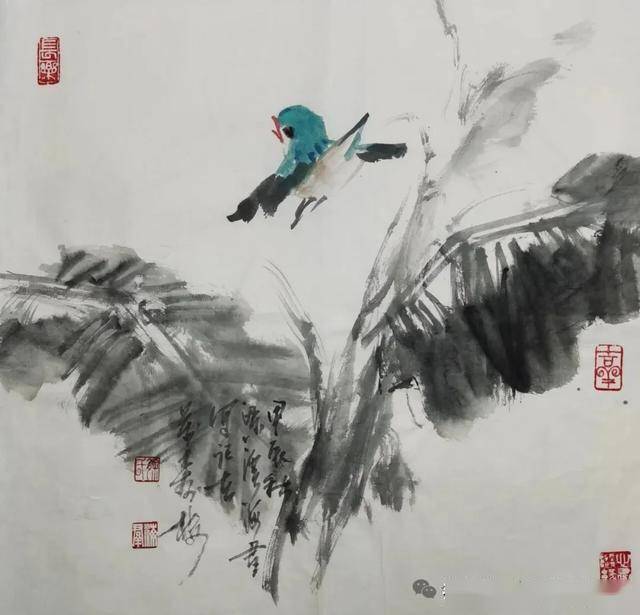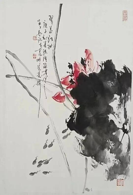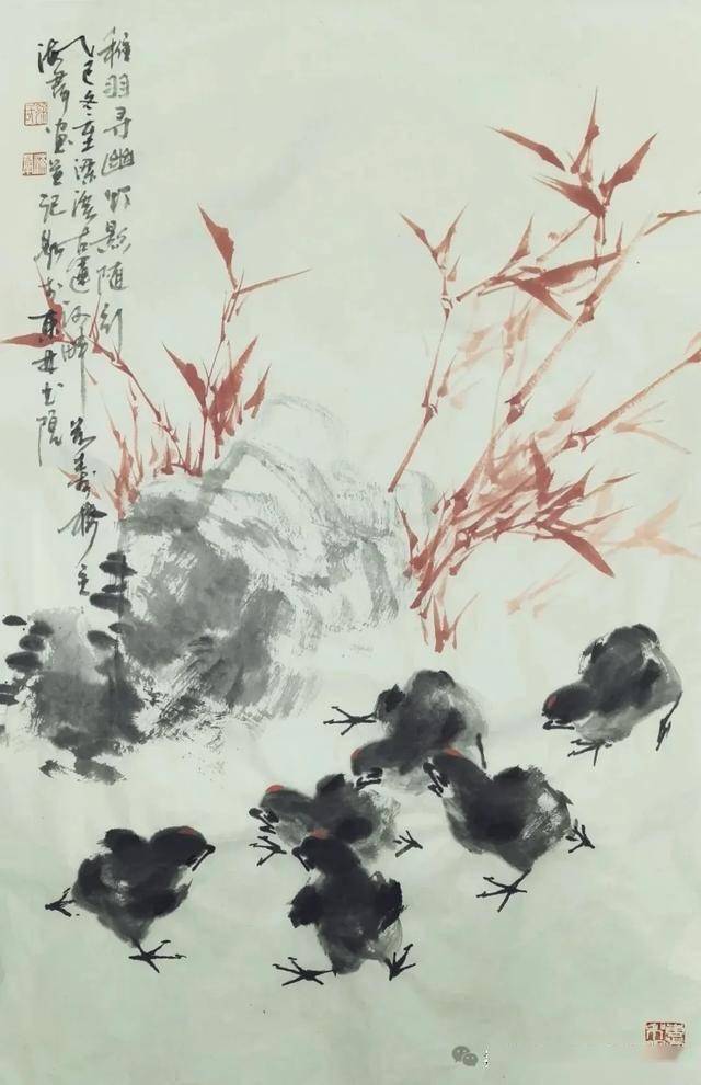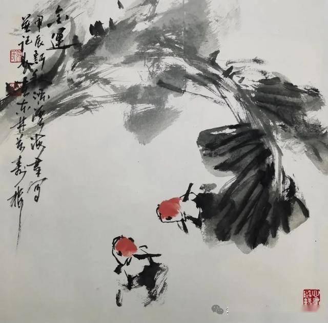 这幅无锡画家徐海群的写意花鸟《细雨鱼儿出》作品,延续了他一贯的“以墨写意、以色点睛”的创作风格。