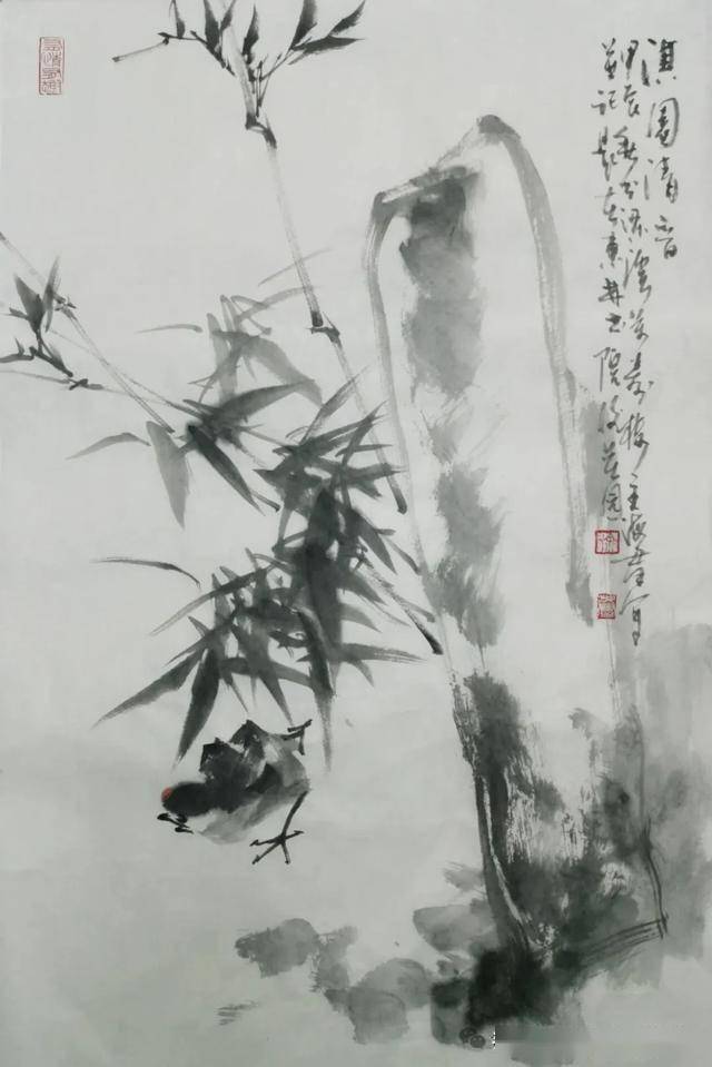 画面右侧的山石以大笔泼墨而成,墨色从浓黑到淡灰自然过渡,通过墨块的大小、虚实变化,塑造出山石的体积感与湿润质感。这种写意手法既体现了传统文人画的“墨分五色”,又带有现代抽象的视觉张力。