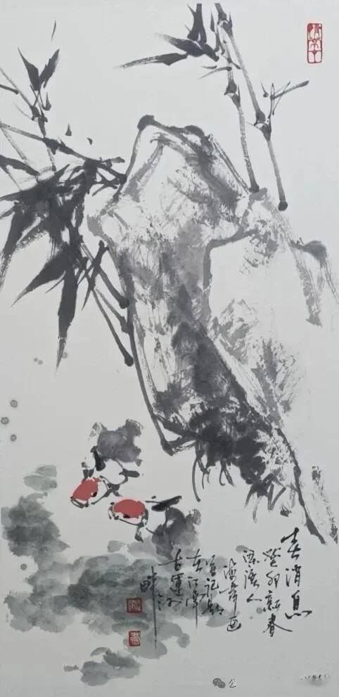 这幅画取材于杜甫《水槛遣心二首》中的名句“细雨鱼儿出,微风燕子斜”,通过水墨与色彩的结合,生动再现了诗句中的意境。细雨濛濛的氛围通过淡墨的晕染得以体现,游鱼的悠然自得传递出一种亲近自然、闲适自在的生活意趣,是传统诗意与当代写意手法的完美融合。