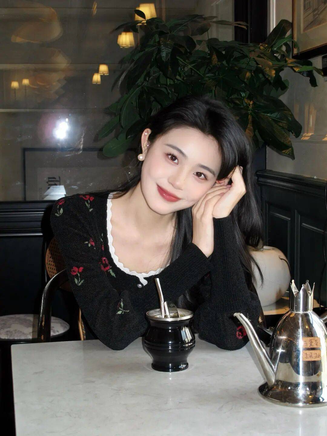 光线是典型的室内暖调,没有刻意追求强对比,而是顺着环境光均匀铺开,皮肤质感显得温和耐看。黑色碎花裙在这样的光线下不会显沉,反而多了一点复古滤镜般的温度。看到这张照片时,我会想到那种下午不赶时间的咖啡馆时刻,人是放松的,笑也是自然发生的。