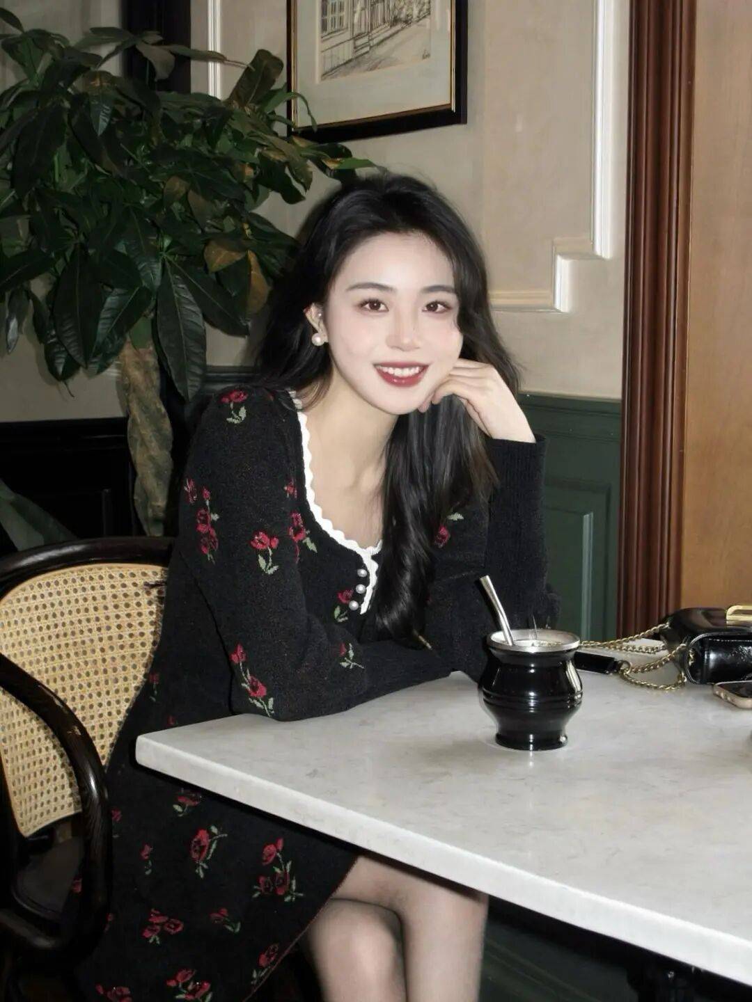 午后的咖啡馆、被绿植包围的露台、随手一站就很有味道的街角,这组照片选取的都是再普通不过的生活场景。但正是这些“不刻意”,让黑色碎花裙成了画面里最稳定、也最耐看的存在。从室内坐姿到室外站姿,整组拍摄都围绕着一个核心——普通人如何在自然状态下,被拍得精致又好看。看这些照片时,我会明显感觉到摄影师在刻意压低技巧的存在感,把重点交还给姿态、光线和情绪本身,这恰恰是最难得的地方。