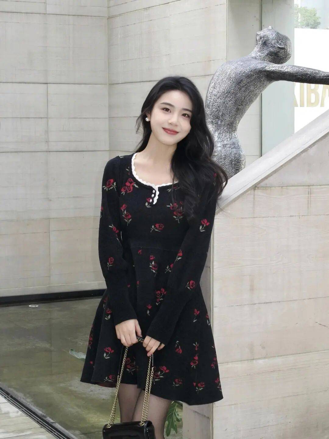 建筑的硬朗线条与裙装的柔软图案形成对比,却没有冲突感。人物与雕塑的位置关系也让画面保持了平衡,看起来稳定而耐看。