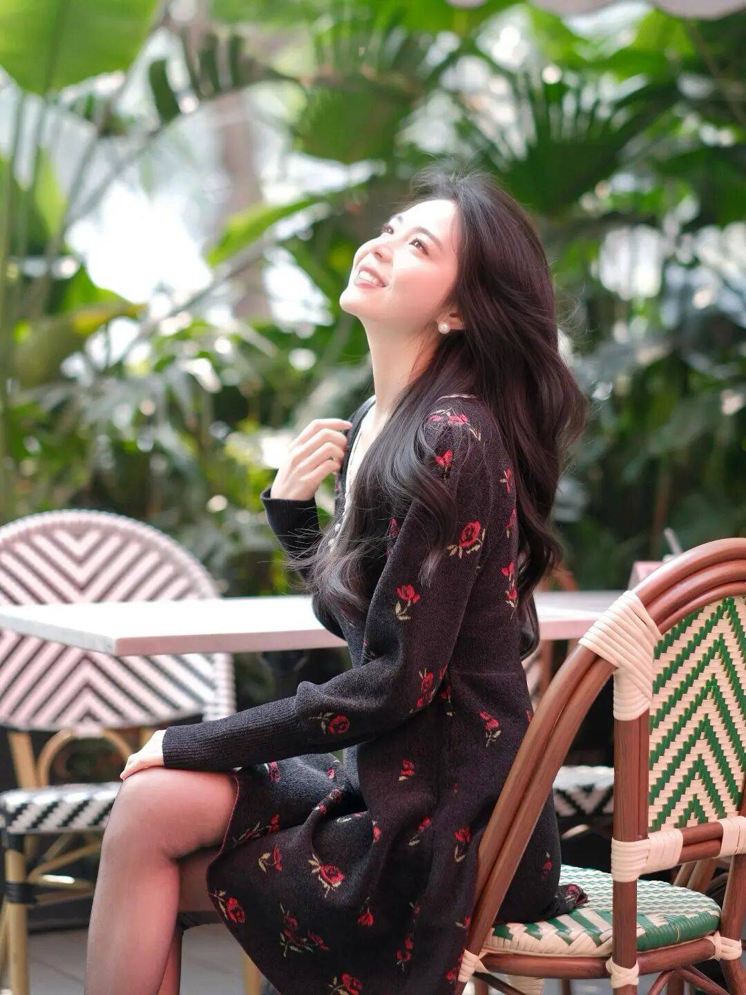 第六张刻意避开了镜头交流。人物坐在露台椅子上,仰头看向斜上方,这个动作让颈部线条自然拉伸,也让表情显得更放松。构图上给环境留出了足够空间,茂密的绿植填满背景,画面生机感很强。