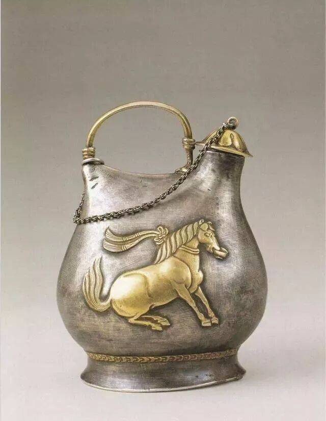 这件银壶的造型是模仿北方游牧民族的皮囊制成,