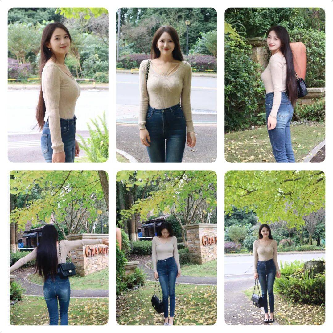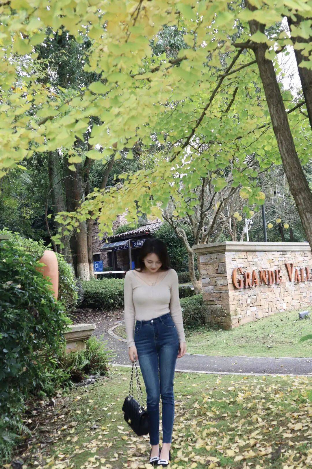 第二张选了小路的弯道来引导视线。人物站在弯道内侧,身体微微侧转,既让牛仔裤的线条更舒展,又避免了正面站立的呆板。地面的落叶和延伸的小路形成了引导线,把观众的目光一步步引向人物。要是直接站在路中间拍,画面会很平,少了这种纵深的呼吸感。