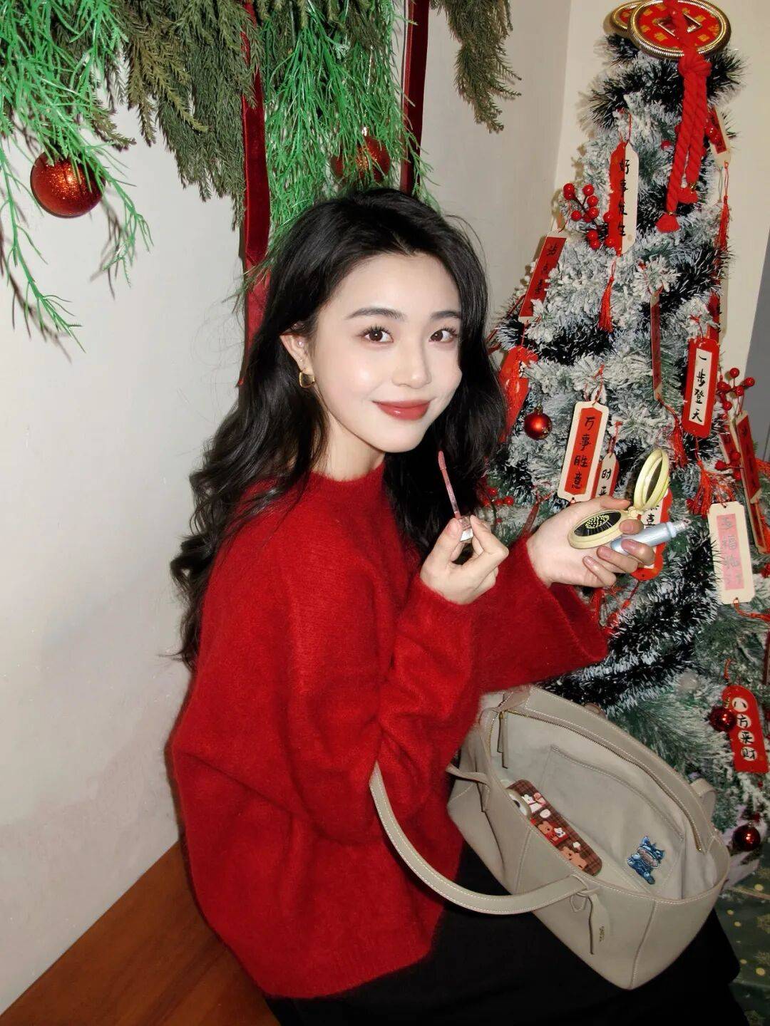 人物往年味满满的布景旁一坐,手里拿着彩妆小物件不用僵着,胳膊自然搭着、身体松松散散的,咋自在咋来。红毛衣的贵气感刚好衬这新年氛围,不用硬摆造型,顺着周围的喜庆劲儿舒展就行,包包当布景更自然,那种甜俏又贵气的新年感一下就出来了,这么拍氛围感直接拉满