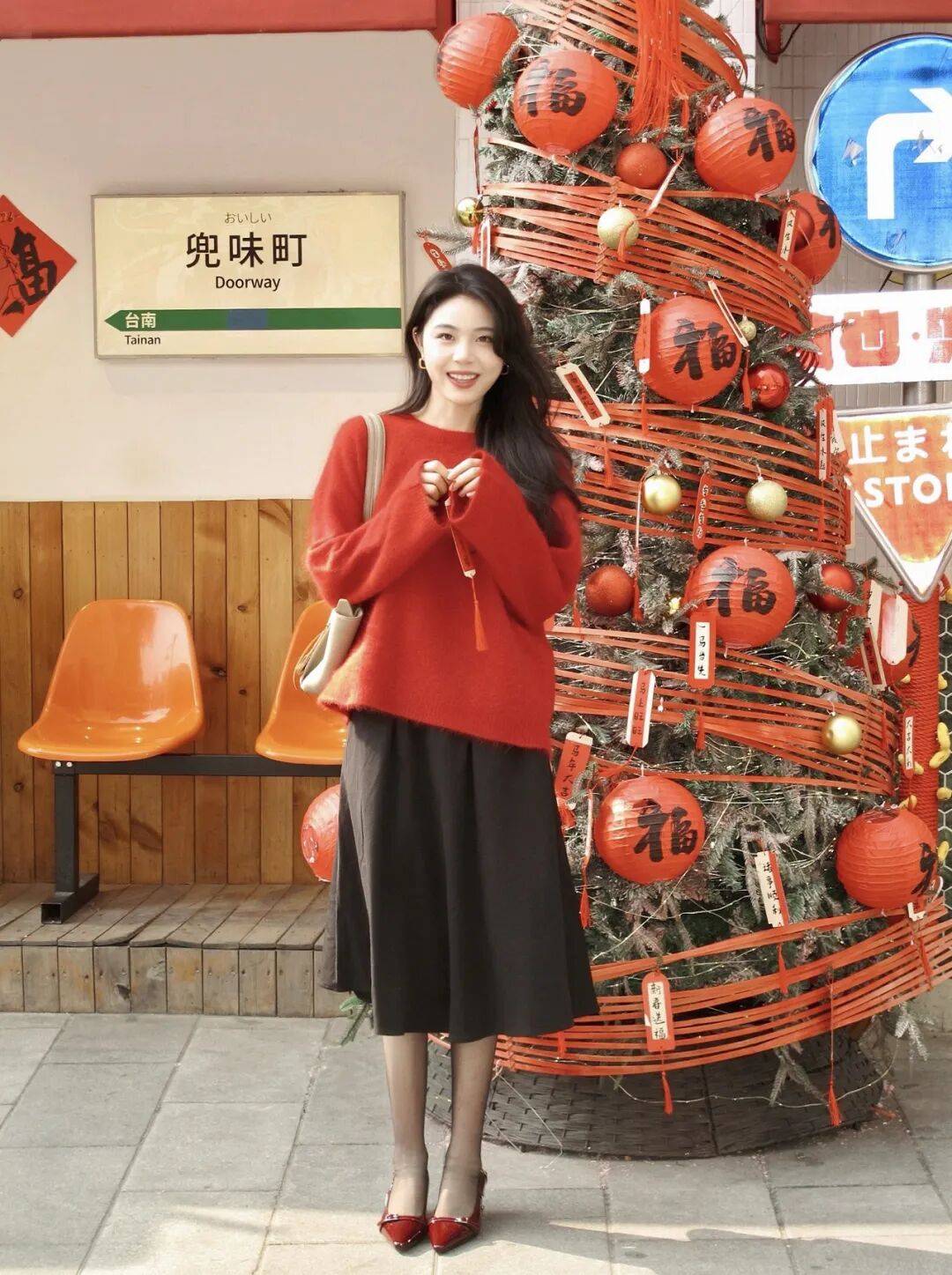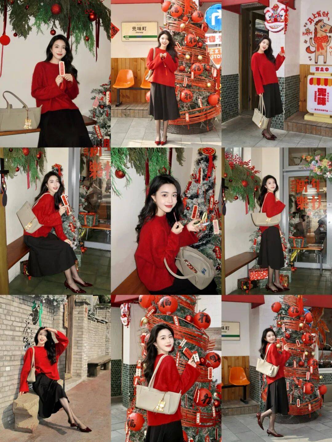 人物往堆满新年装饰的门边一靠,一只手轻搭在包带上,不用绷着身形,怎么放松怎么来。红毛衣配黑裙的贵气感刚好衬这喜庆场景,不用硬摆动作,顺着周围的热闹氛围舒展就行,包包单肩挎着更随性,那种甜柔又精致的新年气质一下就出来了,这么拍氛围感也很是到位