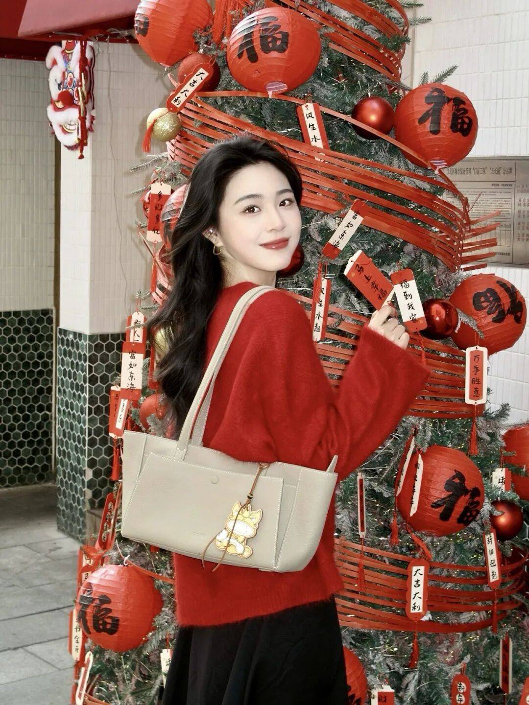 人物往满是“福”饰的装饰树旁一站,双手松松攥着福卡的流苏,不用刻意端着,怎么自在怎么来。红毛衣配黑裙的贵气感刚好衬新年的热闹劲儿,不用硬凹造型,顺着周围的喜庆氛围舒展就行,包包斜挎着更随性,那种甜俏又贵气的新年气质一下就出来了,这么拍氛围感直接就很足