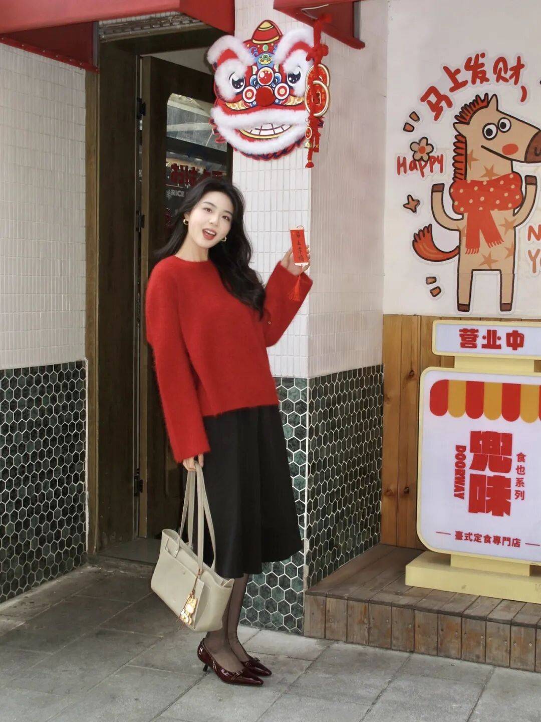 人物往带醒狮装饰的店门边一站,一只手举着福卡小道具,不用刻意摆造型,怎么自在怎么来。红毛衣配黑裙的贵气感刚好衬新年的热闹调,顺着周围的喜庆元素舒展身形,包包拎在手里更随性,那种甜俏又精致的新年气质一下就出来了,这么拍氛围感也很是出挑