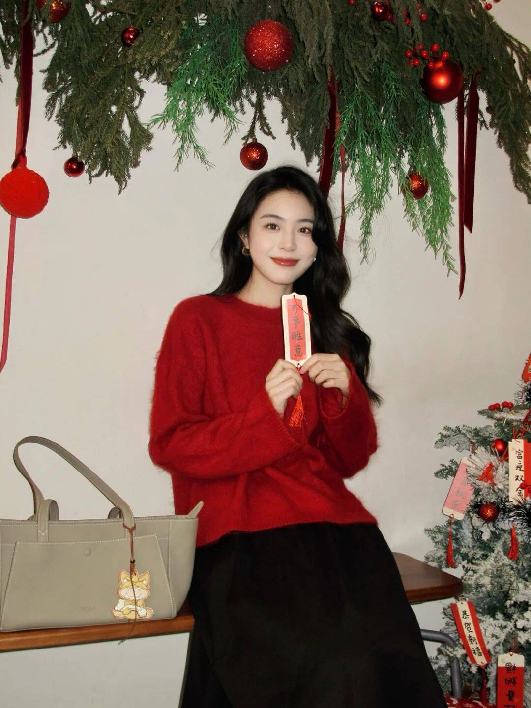 人物往挂满年节装饰的区域一坐,双手松松捏着福卡道具,身体不用绷得僵硬,怎么舒服怎么来。红毛衣配黑裙的贵气感刚好衬新年氛围,不用硬凹造型,顺着周围的喜庆调舒展就行,包包放旁边当布景更自然,那种甜柔又贵气的新年气质一下就出来了,这么拍氛围感直接拉满
