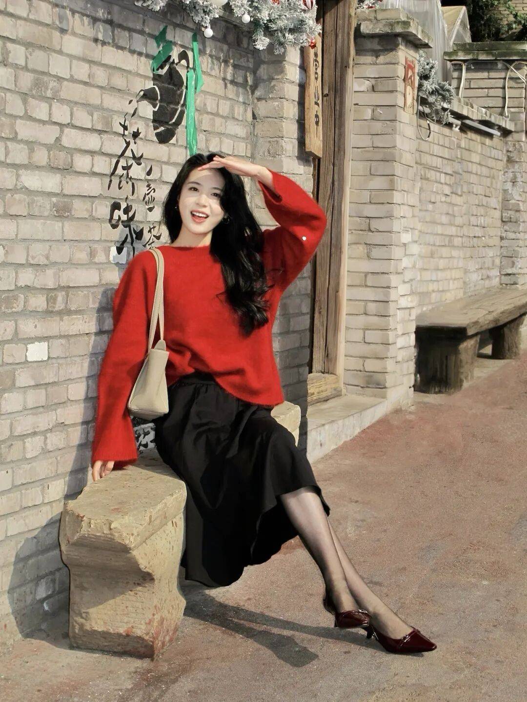 人物往砖墙边的石墩上一坐,一只手抬起来轻遮额头,不用僵着身形,怎么放松怎么来。红毛衣配黑裙的贵气感刚好衬这复古场景,顺着环境的松弛调舒展姿势,包包斜挎着更随性,那种甜俏又灵动的气质一下就出来了,这么拍氛围感也很是自然好看
