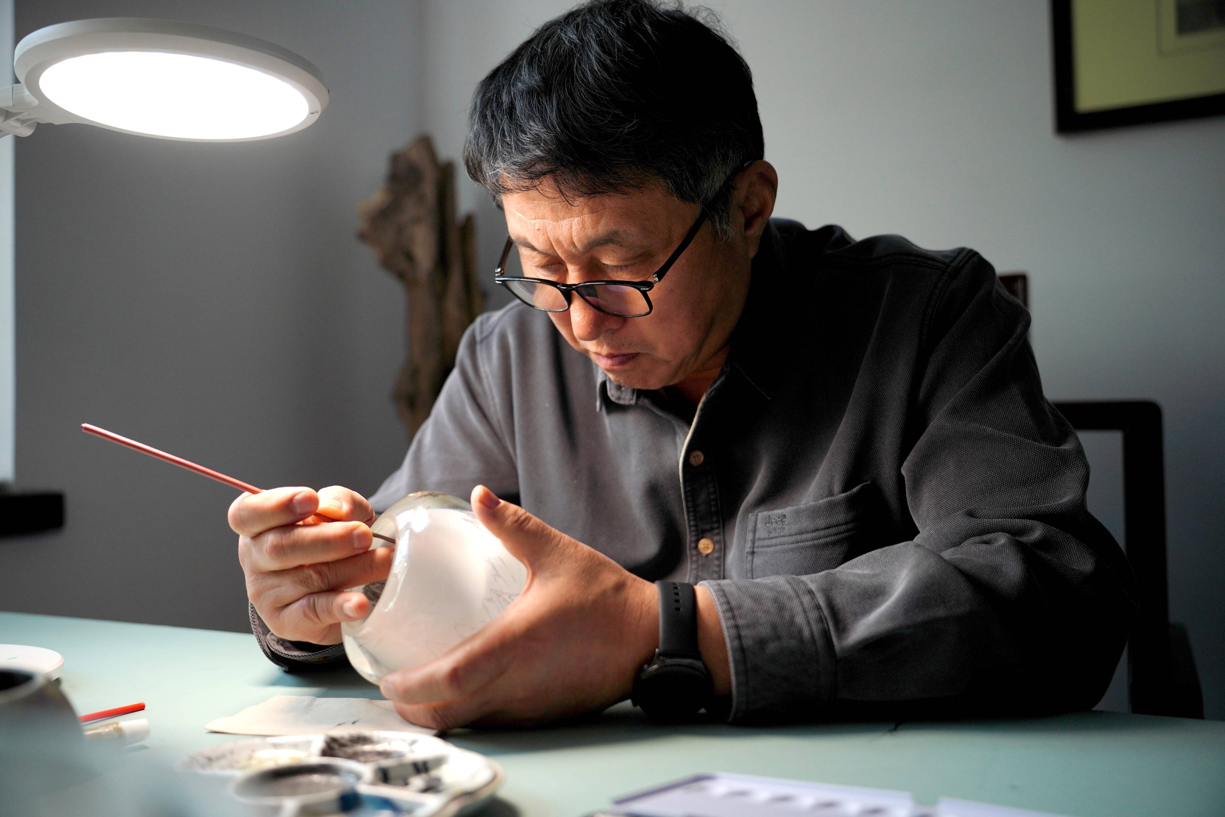 他主导创作的《盛世宏图》等作品,尝试在内画中融入宏大的国家叙事与东方美学。他明白,最好的致敬不是原地踏步,而是让这门非遗艺术,在年轻一代的视野里重新“活”过来。