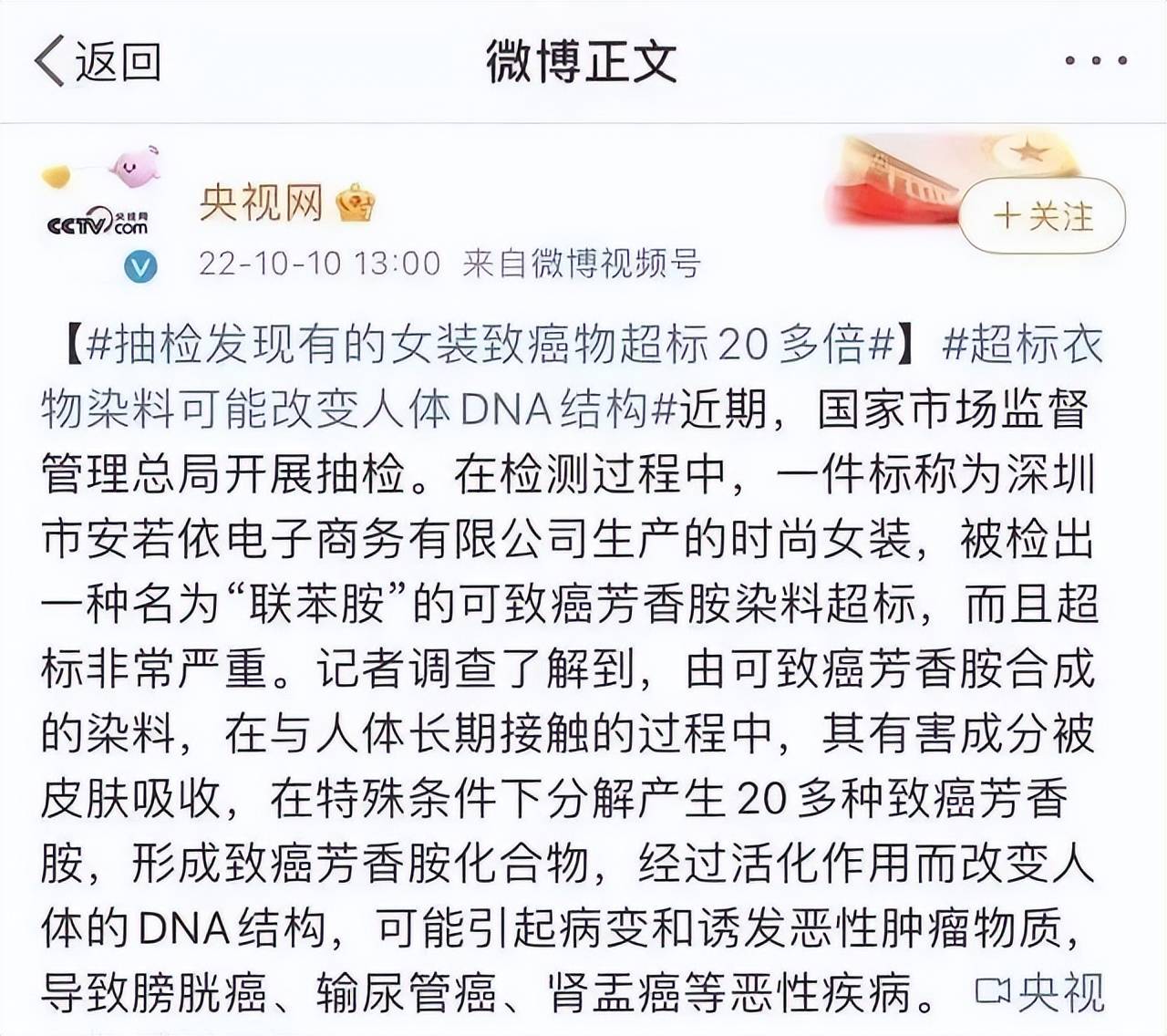 那些年,监管部门没少行动,2019年又扩了范围,电商平台的货也拉去验,荧光增白剂超标的情况一大把。2022年10月,转到服装上,深圳抽检女装,联苯胺超了27倍,540mg/kg,国家标准才20mg/kg。整体不合格率19.2%,袜子也中招,95批中16批有问题。