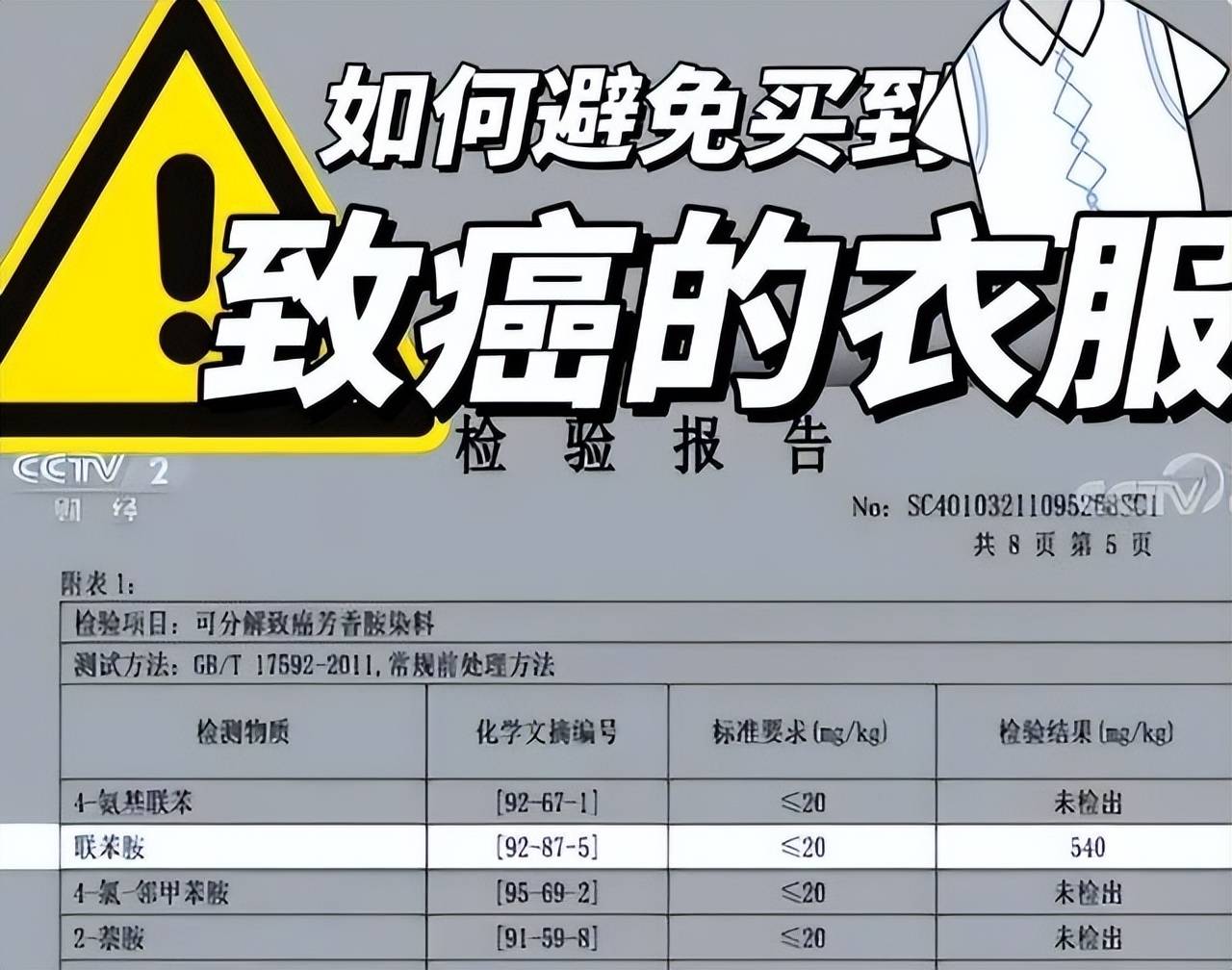 最后说含毒衣服,五颜六色染色后掉色常见。植物染料安全,化学染料藏联苯胺,一类致癌物。2005年国家纺织中心抽珠三角1051份,超标190倍。2022年10月央视报道,深圳女装540mg/kg,超27倍。染色桶搅拌,布料浸泡。洗时水浑,残留难除。